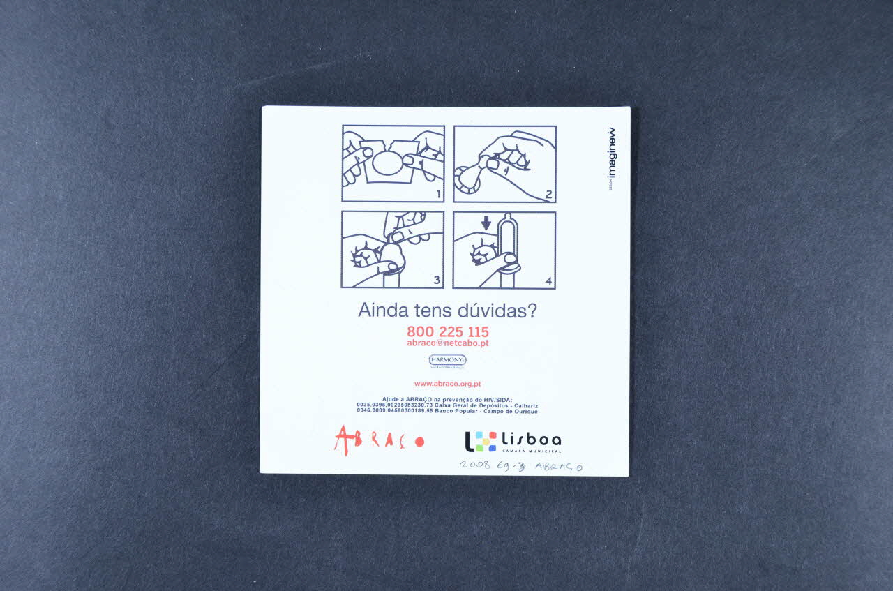 Son recto est composé d'une large inscription en anglais, en blanc sur fond vert. L'une des lettres du deuxième mot est remplacée par un préservatif rond. L'arrière comporte quatre schémas sur fond blanc expliquant la pose d'un préservatif. Ils sont suivis d'inscriptions en portugais en noir avec numéro de téléphone rouge, et deux logos en partie inférieure.Inscriptions