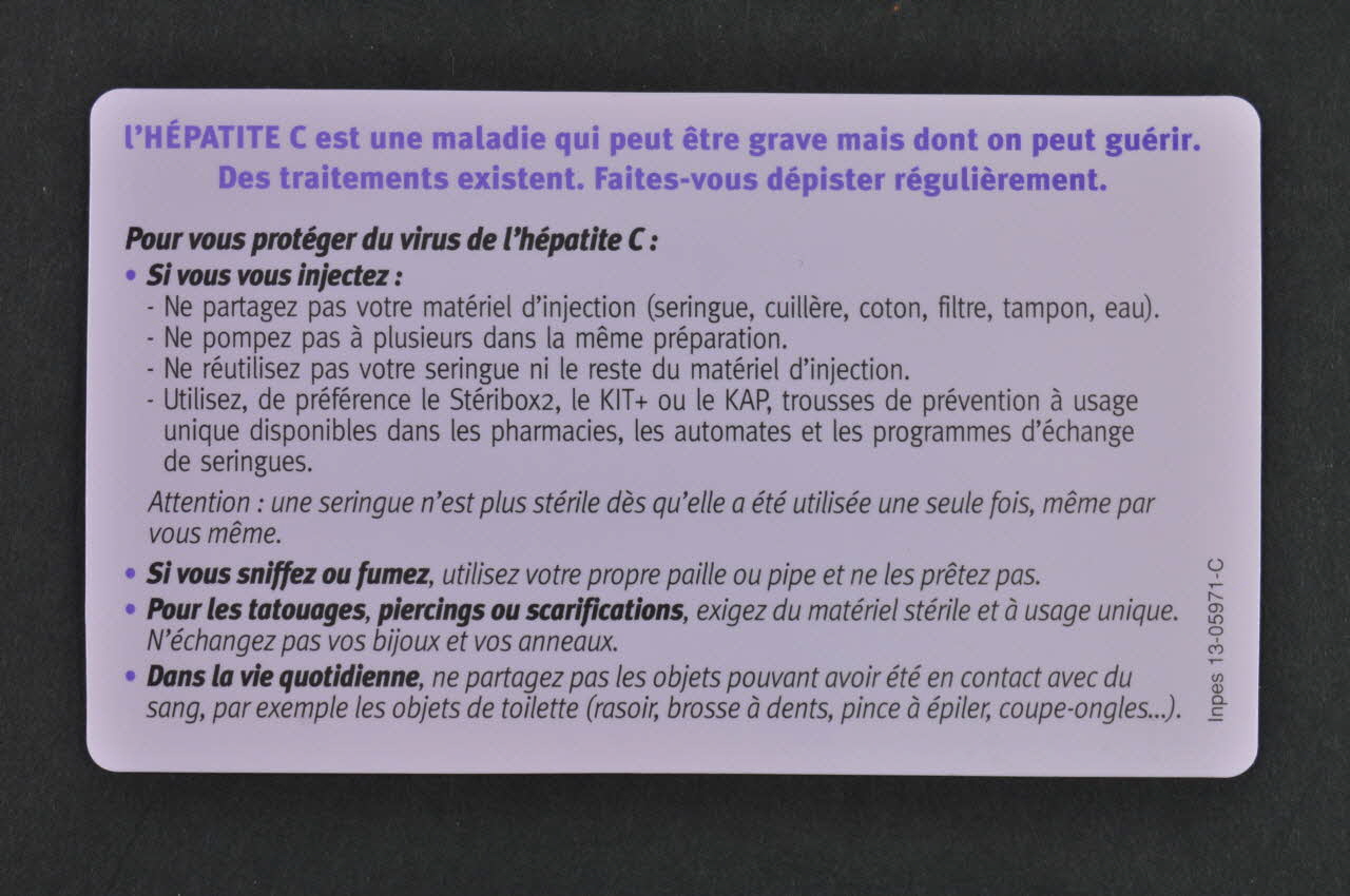 L'hépatite C est une maladie qui peut être grave mais dont on peut guérir. Des traitements existent. Faites-vous dépister régulièrement. // Pour vous protéger du virus de l'hépatite C // Si vous injectez.... // Si vous sniffez ou fumez... // Pour les tatouages, piercings ou scarifications... // Dans la vie quotidienne (en gras), versoNom d'association, adresse