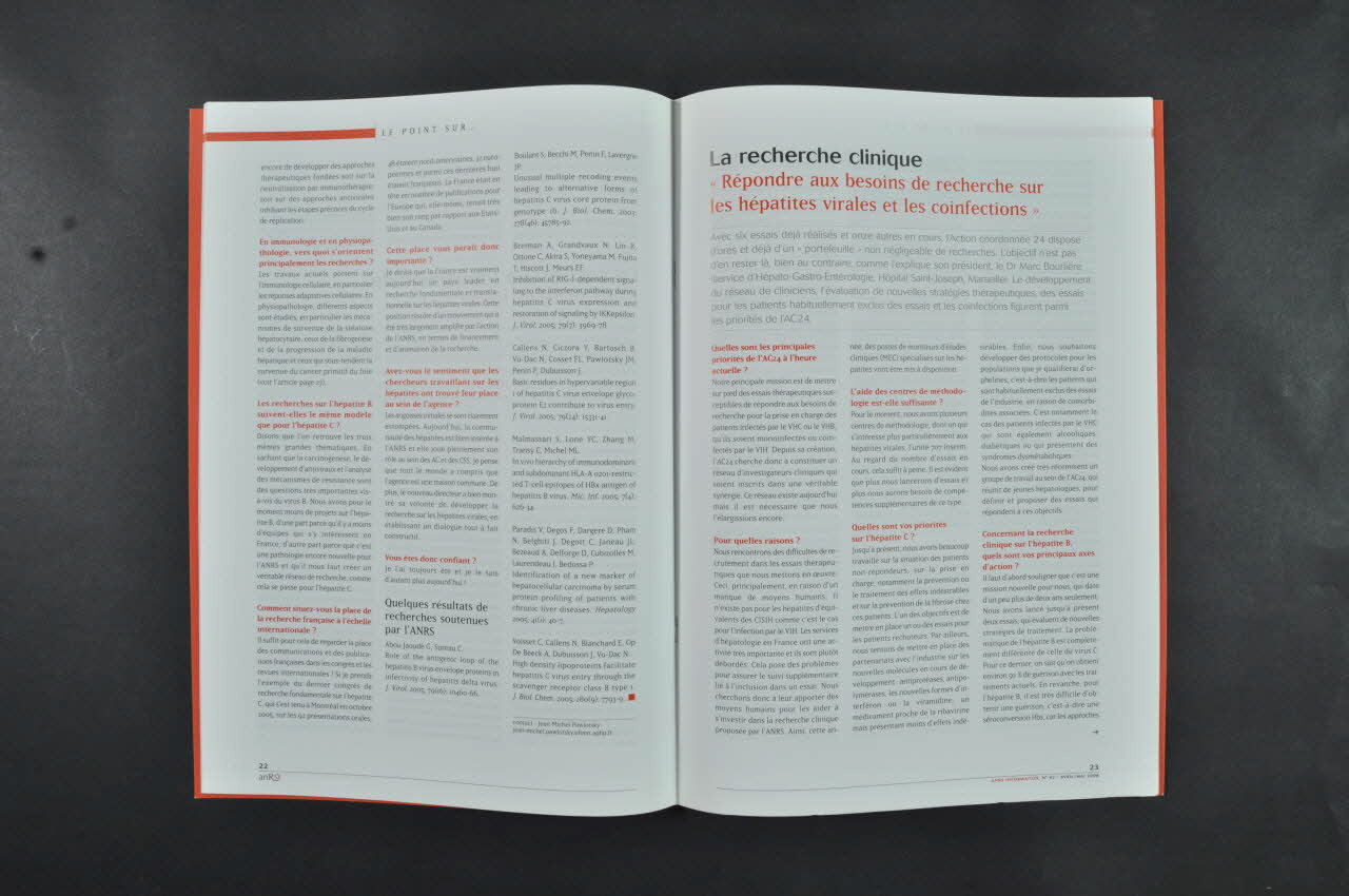 Page 2 // Editorial // // Page 7 // Les résultats // des appels d'offres // // Page 19 // La recherche sur les // hépatites virales: // une dynamique // bien engagée // // Page 35 // L'actualité des essais // et des cohortes (Sur le fond rouge, dans l'encart blanc), sur la couvertureNuméro, texte, date