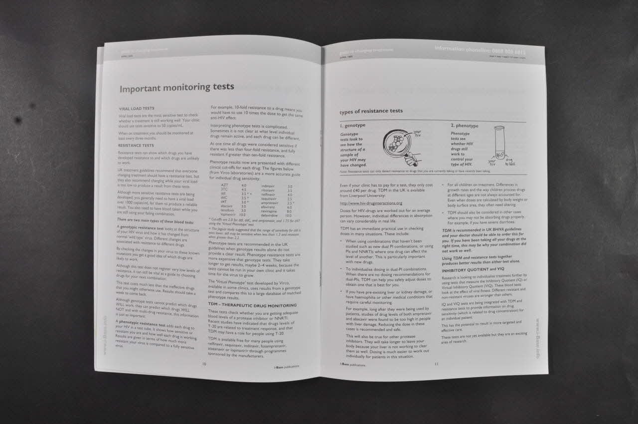 Glossary 2 // Summary 3 // Introduction to the April 2005 edition 4 // A note on resistance and adherence 5 // What, why, how... 6 // What to do about a rising viral load 7 // Why a combination can fail 9 // Important monitoring tests 10 // Choices for your next combination 13 // Treatment strategies 14 // [...] // Changing to avoid side effects 18 // Expanded access and experimental drugs 19 // Further information 20 (Imprimé en noir sur blanc sur la gauche de la page 2), à l'intérieurDécor