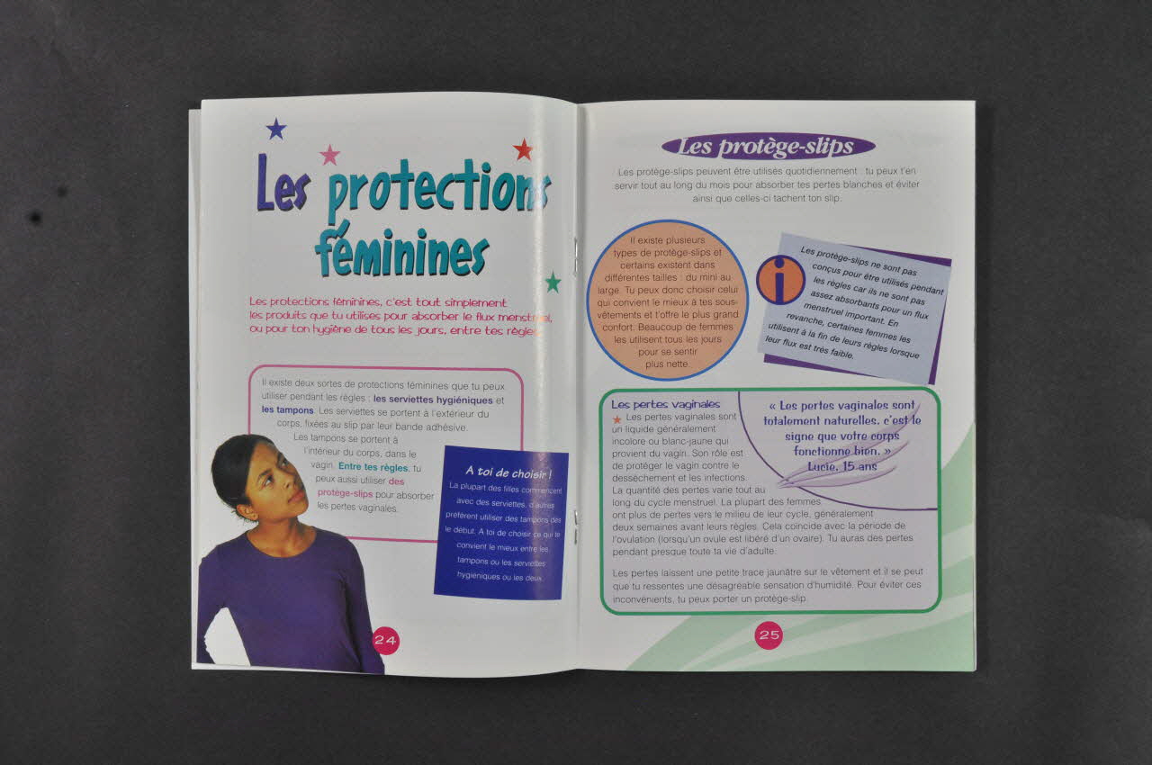 Sur la couverture figurent dix photographies couleur d'adolescentes aux contours ondulés sur un fond bleu. Le titre est coloré de rose, rouge et jaune. Un logo est disposé sur le coin supérieur droit. Le dos comporte des informations blanches liées à la conception du document sur un fond bleu. L'intérieur, très coloré, comprend des textes, notamment des témoignages, souvent en caractères noirs accompagnés de titres et encarts en couleur. Les schémas et les photographies d'adolescentes sont nombreux.Inscriptions