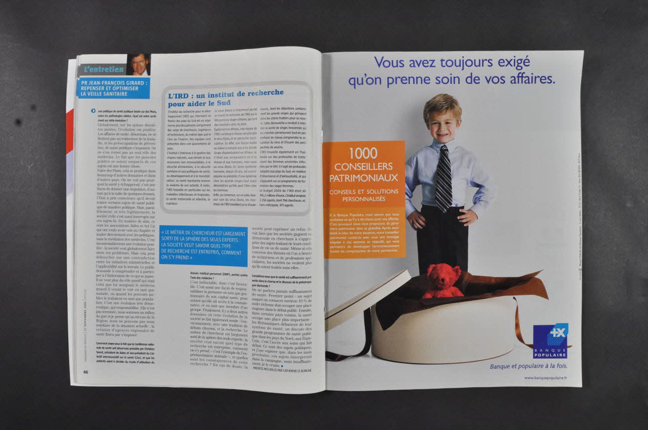 Précisions sur le contenu : - p.5 Sommaire. Encadré en blanc et noir sur fond bleu : "page 26 / Enquête. / Lutte contre le sida : les nouveaux défis. /Spécialistes et malades reconnaissent que la France n'a pas à rougir de sa politique de lutte contre le sida. Mais l'accompagnement social des malades et l'adaptation des stratégies de prévention restent largement insuffisants. Avant la Journée mondiale sur le sida du 1er décembre, Panorama du Médecin fait le point sur les atouts et les faiblesses de la France, avec tous les risques que la banalisation de cette maladie comporte." - p.26 à 43 : Enquête. Lutte contre le SIDA Les nouveaux défis. - p.26. Fond noir, impression en blanc (sauf, dans le titre, SIDA, en rouge). En encadré sur bandeau rouge : "Actuellement 30 à 40 % des personnes testées positives dans les centres de dépistage anonymes et gratuits ne retournent jamais chercher leurs résultats" - p.27 photo pleine page d'un enfant africain triste assis par terre - p.28-29 Fond blanc, impression en noir sur 3 colonnes, sous titres en bleu : "Les associations : des relais indispensables / Repenser les modalités du dépistage". Photos couleur : dans un local associatif, jeune homme présentant un préservatif à un autre jeune homme. Légende en blanc sur fond bleu : "Une pudibonderie qui empêche d'adapter les messages de prévention aux populations à risque" / Petite photo d'un homme sur fauteuil roulant dans un laboratoire. Petite photo d'éprouvettes de sang dans un laboratoire illustrant un petit article en encadré : "Le CNS veut faire évoluer le dépistage". En colonne en encadré, avec petite photo couleur de la couverture du livre : critique du livre Vivre avec le VIH de Rommel Mendès-Leite et Maks Banens. - p.31-34 "Des médecins de ville qui manquent à l'appel". Fond blanc, impression en noir sur 3 colonnes, sous titres en bleu : "Ce n'est plus une priorité / Engorgement des cabinets de ville". Encadrés en blanc sur fond bleu : "Il est très difficile pour un médecin généraliste de se tenir au courant de l'évolution de la pathologie et de la thérapeutique." / "Les médecins de ville fonctionnent dans les réseaux hospitalo-centrés" / "Un obstacle parmi d'autres : le manque de temps des généralistes". Photo d'un médecin devant ordonnance et ordinateur avec en légende : "Peu de généralistes sont volontaires pour redynamiser les réseaux ville-hôpital" - p.33 Encadré fond gris, impression en noir. Titre vertical à gauche en rouge : "Journée du sida en France". exemples d'actions menées à Lyon, Marseille, Nice, Sarreguemines, Strasbourg, Paris, Nantes. Illustration : 2 vignettes couleur : l'affiche d'ONUSIDA : Stop SIDA. tenons notre promesse et préservatif dans une poche de jean. - p.36-37 "Christine Katlama. Après les trithérapies VIH : des progrès continus" (interview). Fond blanc, impression en noir sur 3 colonnes. Encadrés en blanc sur fond bleu : "On traite probablement un peu tard. A mon avis, on va aller vers une instauration du traitement pour des taux de CD4 inférieurs à 500" / "Les échecs thérapeutiques sévères devraient diminuer". Encadré (en gris). Titre en bleu : "De nouvelles classes en préparation". Illustration : représentation du virus (boule à piquants oranges). "En vignette : photo couleur de Christine Katlama. - p. 38 "En France, les signes d'une recrudescence de l'infection". Fond blanc, impression en noir sur 3 colonnes, sous titres en bleu : "La recrudescence concerne essentiellement les homosexuels et les migrants. / Principale voie de contamination : les rapports hétérosexuels". Illustration : photo couleur de deux garçons tenant une pochette de préservatifs. Graphiques épidémiologiques. - p.39 "La pandémie ne régresse pas". Fond blanc, impression en noir sur 3 colonnes, sous titre en bleu : "La riposte mondiale au sida marque le pas. Si de nouveaux efforts en matière de prévention et de traitements ne sont pas rapidement réalisés, la pandémie ne reculera pas d'ici à 2015 comme l'escomptait l'Onusida". Titres de paragraphes en noir : "Toujours l'Afrique" / "Inde, Vietnam, Chine : une progression inquiétante" / "Les bons chiffres du Brésil et de la Thaïlande". Illustration : planisphère légendé : "La carte du monde de la prévalence" - p.41-42 "Christian Saout. Il y a un vrai risque de redémarrage du sida" (interview). Fond blanc, impression en noir sur 3 colonnes. Sous titre en bleu : "Le dépistage tardif est l'une des principales causes de la propagation de la maladie, selon le président de Aides". Encadrés en blanc sur fond bleu : "Il faut redoubler d'intensité dans deux directions : la prévention, avec notamment la promotion du préservatif, et la réduction de la stigmatisation, qui reste un combat de société" / "Pouvoir dire que l'on est séropositif sans craindre le rejet permet de mieux vivre, et donc de mieux combattre la maladie". En vignette : photo couleur de Christian Saout. - p.43 "Le combat du Comité des familles contre les idées reçues". Fond blanc, impression en noir sur 3 colonnes. Sous titres en bleu : "Fréquence 106.3 : la parole aux familles. Chaque mardi à 17 heures, l'équipe du Comité offre aux personnes séropositives et à leurs proches un espace de témoignage" / "Avoir un enfant" / "Secret médical rompu". Illustration sur fond bleu, en couleur : reproduction de la pancarte : "Familles maghrébines et africaines solidaires pour survivre au sida", légendée en blanc : "La vérité, c'est que ce virus a une tête chercheuse pour le bas de l'échelle sociale"