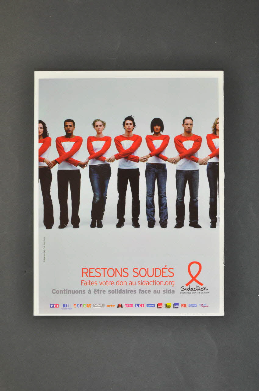 La couverture s'organise autour de la photographie d'un combiné téléphonique noir sur fond blanc. Le nom de la revue en noir avec le "E" remplacé par un ruban rouge est dans la partie supérieure, suivi de la date et du numéro de la revue. Il y a un sous-titre en rouge au centre. Dans la partie inférieure, se trouvent le logo du Sidaction et une inscription en noir. Le verso se compose d'une affiche représentant des garçons et filles habillés en jeans et avec un sweat blanc aux manches rouges. En se tenant les mains et en croisant les bras, cela forme un ruban rouge. Dans la partie inférieure, se trouvent un slogan en rouge et le logo du Sidaction, ainsi que les logos des partenaires. A l'intérieur, le texte est en noir, parfois mis en valeur dans un encart de couleur. Un sommaire est présent à la page trois.Inscriptions