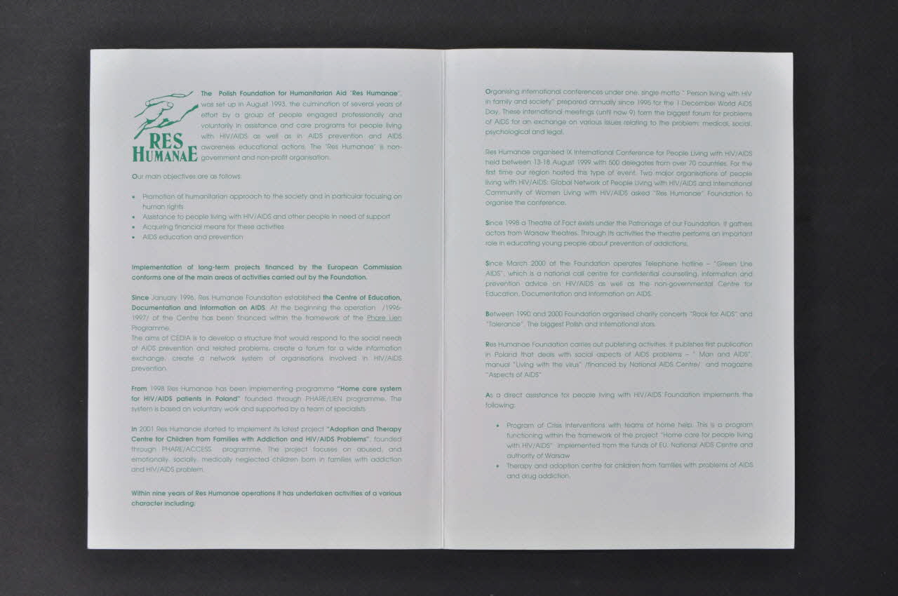 [logo] // RES // HUMANAE // // The Polish Foundation for Humanitarian Aid "Res Humanae" // [...] (Au sein des deux feuillets. En vert sur fond blanc.), à l'intérieurLogo, adresse