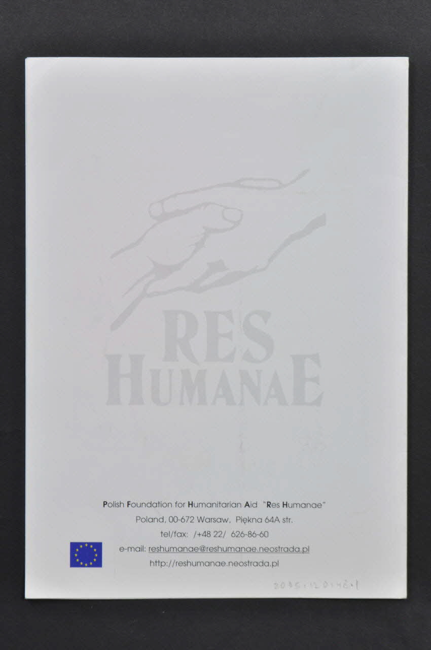 [logo] // RES // HUMANAE // // Polish Foundation for Humanitarian Aid "Res Humanae" // [coordonnées] (Au centre et dans la partie inférieure sur fond blanc.), versoDécor