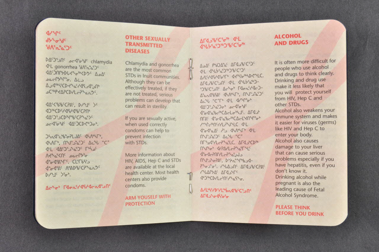Les pages sont ornées en sous impression d'un grand ruban rouge en biais. Le texte y figure en noir sur deux colonnes : à gauche en inuit, à droite en anglais.