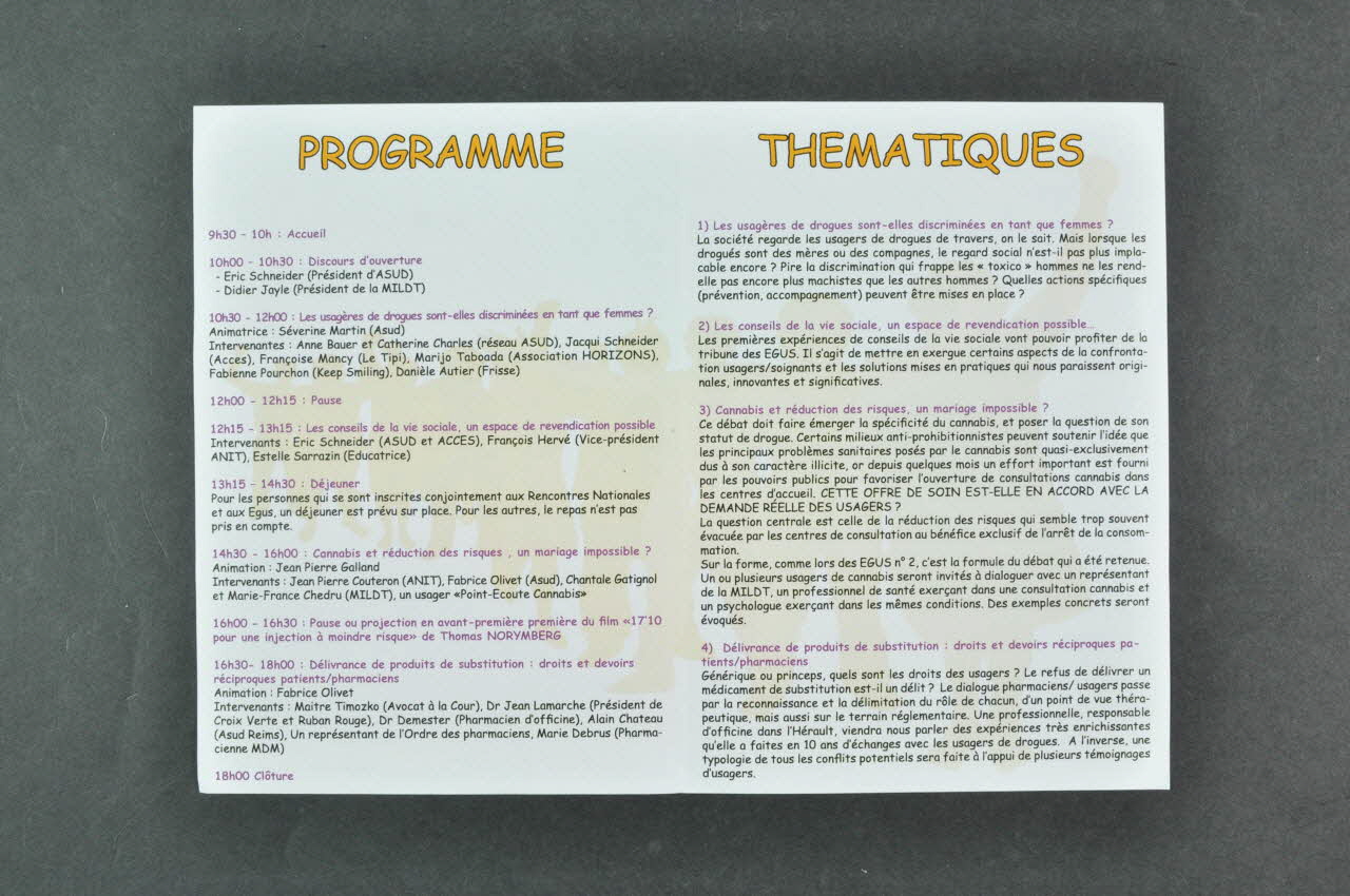 Programme // // Thématiques // // 1. Les usagères de drogues sont-elles discriminées en tant que femmes ? // // 2. Les conseils de la vie sociale, un espace de revenducation possible... // // 3. Cannabis et réduction des risques, un mariage impossible ? // // 4. Délivrance de produits de substitution : droits et devoirs réciproques patients / pharmaciens. (programme et thématiques des états généraux), à l'intérieurTexte