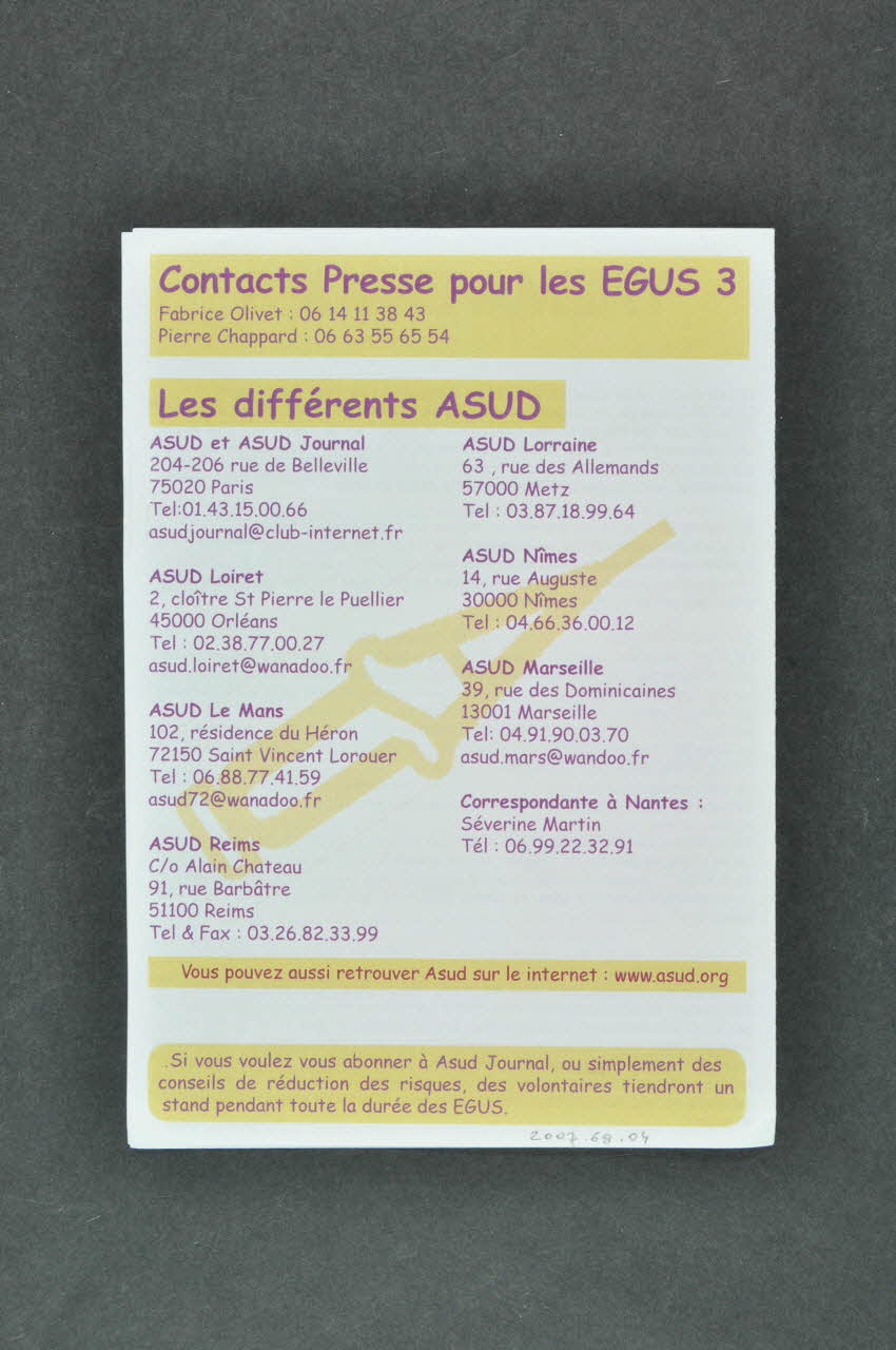 ASUD présente les // EGUS 3 // Etats Généraux // es Usagers // de Drogues // // Cannabis et réduction des risques // Pharmaciens et usagers // Drogues au féminin // // Les drogué(e)s // se mobilisent // // 11 octobre 2006 // Canal 93 // [...] // avec le soutien de // La Mairie de Bobigny, // la MILDT, Shering-plough, // Arrow, Bouchara-Recordati // // www.asud.org (Titres et détails sur l'événement), sur la couvertureSommaire