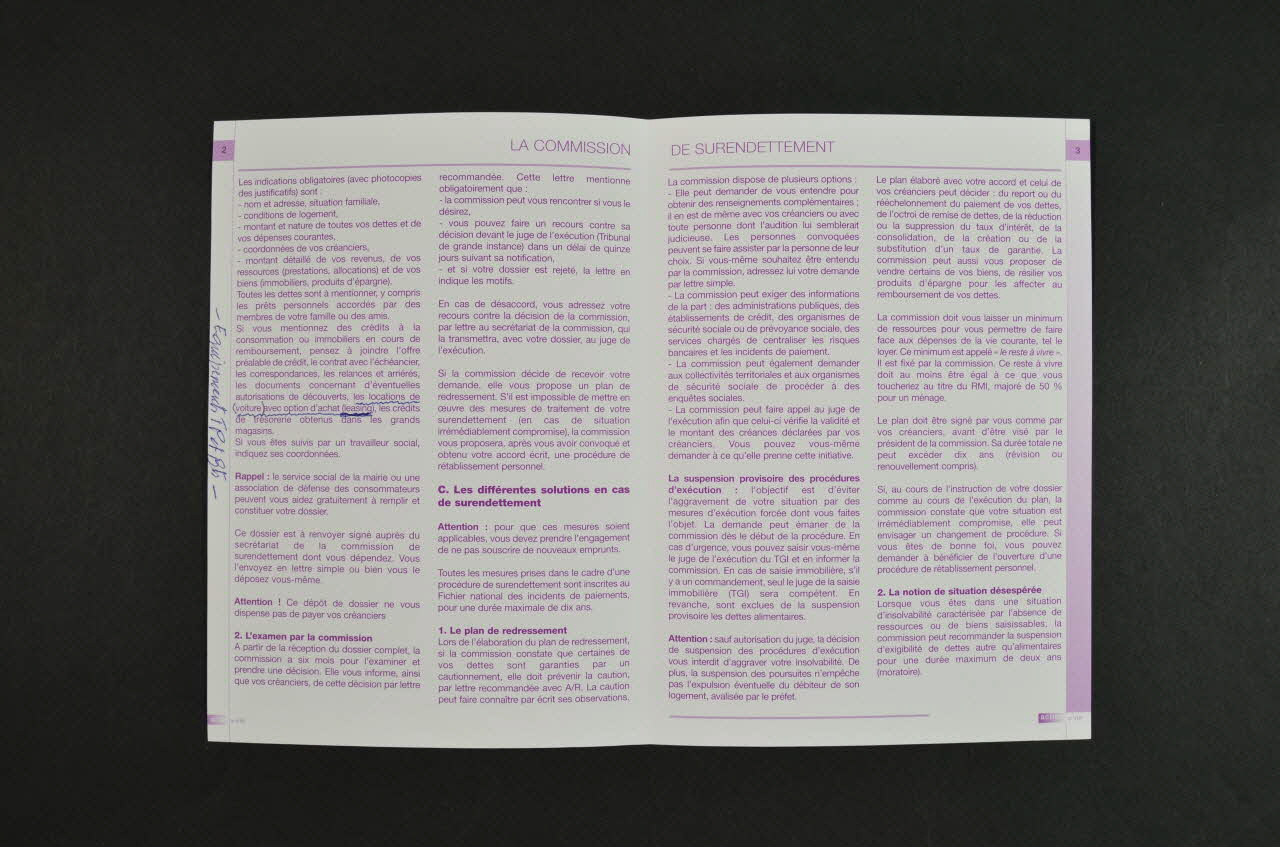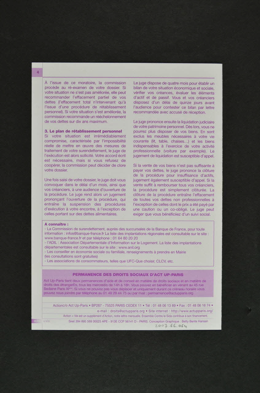 action = vie (Imprimé en blanc sur violet et violet sur blanc dans le haut ; il s'agit du nom du bulletin), sur la couvertureLa commission de surendettement (Imprimé en caractères gras au centre), sur la couvertureNuméro