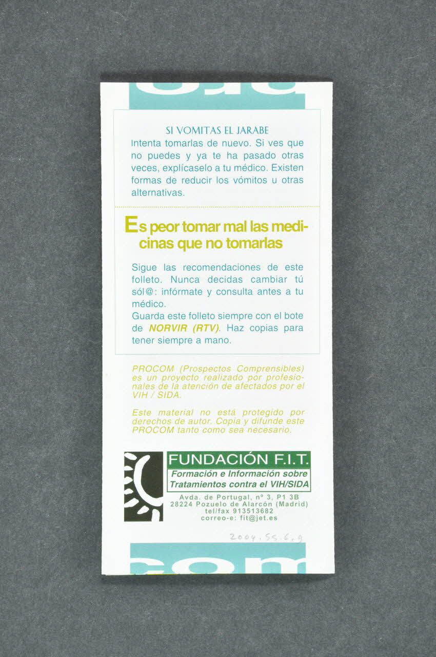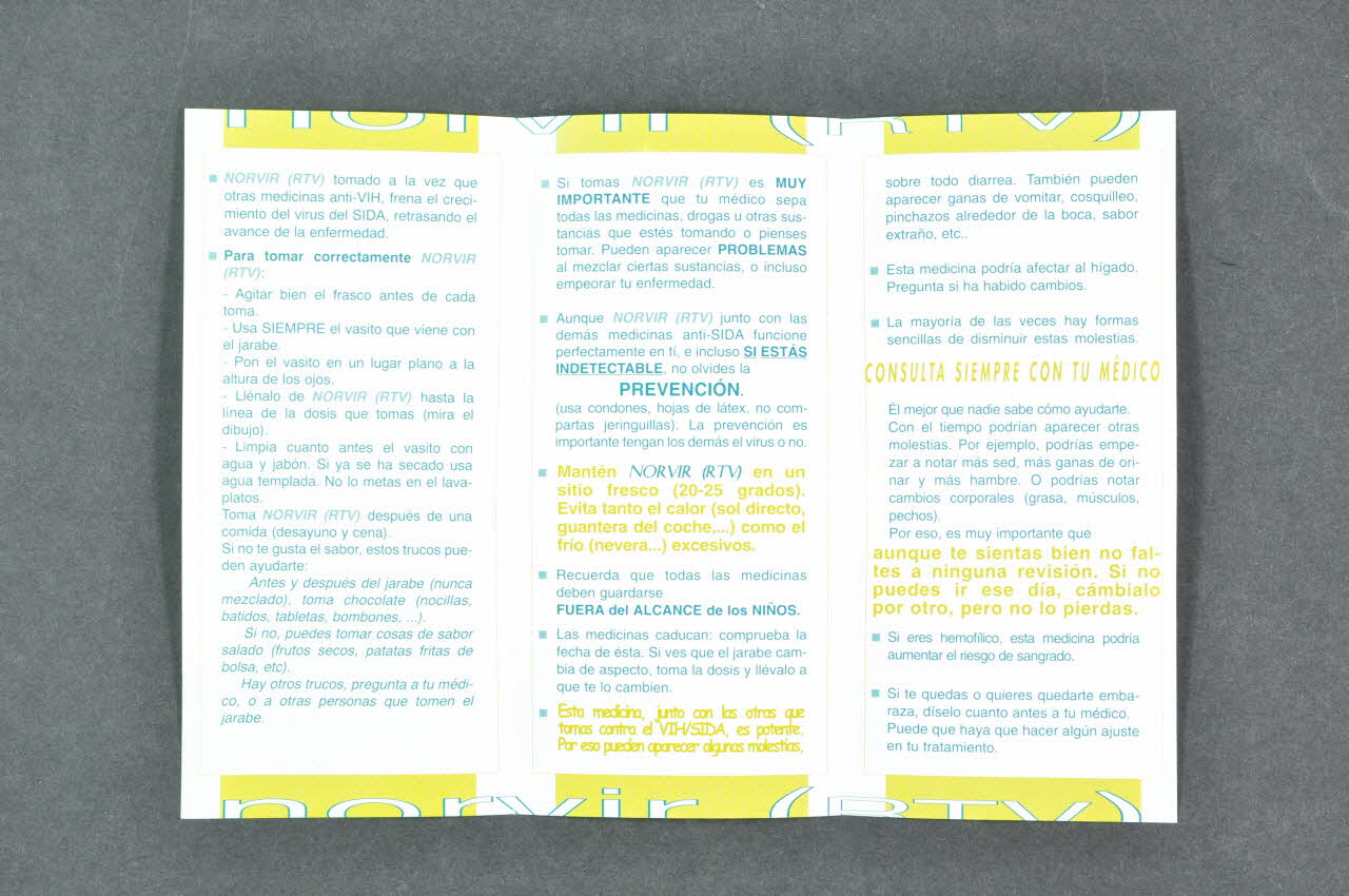 Para tomar correctamente NORVIR (RTV) // // no olvides la // prevención // // Mantén VIRACEPT (NFV) // en un sitio fresco (15-30 // grados). Evita tanto el calor // (sol directo, guantera del // coche,...) como el frio exce- // sivos (nevera,...) // // FUERA del ALCANCE de los NIÑOS. // // Esta medicina, junto con las otras // que tomas contra el VIH/SIDA, // es potente. Por eso pueden apa- // recer algunas molestias, // // CONSULTA SIEMPRE CON TU MEDICO // // aunque te sientas bien no faltes a nin- // guna revisión. Si no puedes ir ese dia, // cambialo por otro, pero no lo pierdas. // // SI TE OLVIDA LA TOMA // // SI INTERRUMPES EL TRATAMIENTO // ANTI-SIDA // // SI VOMITAS LAS PASTILLAS // // Es peor tomar mal las medi- // cinas que no tomarlas (Au recto et au verso.)Décor
