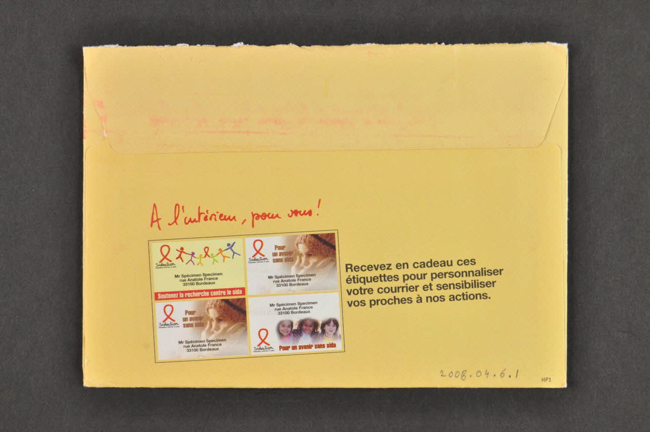 Sidaction // ENSEMBLE CONTRE LE SIDA // BP 206 // 27102 Val de Reuil Cedex (en rouge), rectoTexte