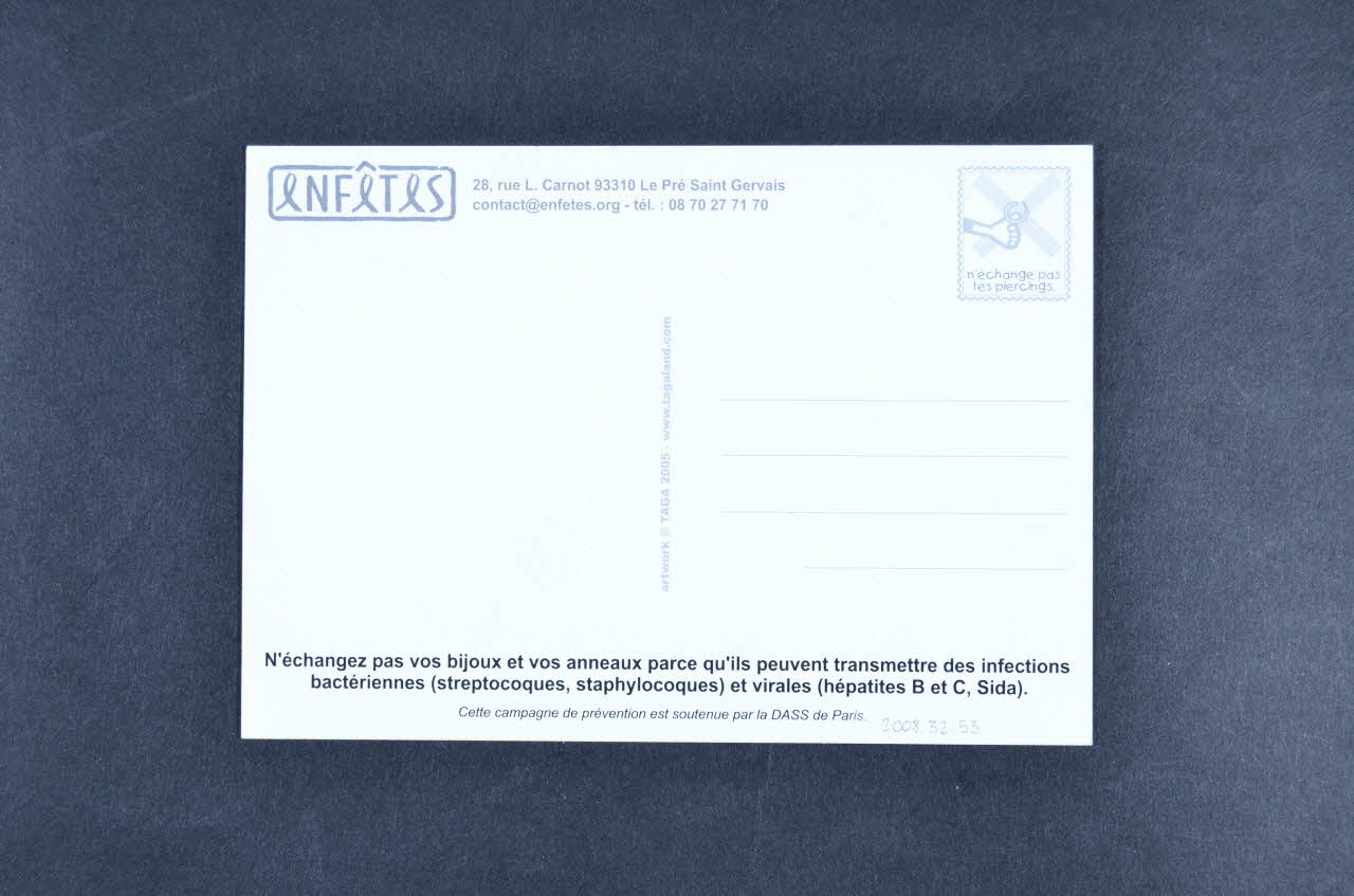 Au recto, un dessin représente sur fond jaune une jeune fille et un jeune homme habillés en noir avec des têtes de mort sur leur tee-shirt et portant des piercings. Elle a deux couettes noires et lui a les cheveux rouges. De chaque côté, il y a un chat noir avec un "?" au dessus de la tête. Elle tend au jeune homme un piercing barré d'une croix rouge. Au dessus de leu tête, il y a des bulles de dialogue blanches. Au verso, un logo gris et des inscriptions grises occupent la partie supérieure. En partie inférieure se trouvent des inscriptions noires. A droite des lignes grises permettent d'inscrire l'adresse et l'emplacement pour le timbre reprend un détail, en noir et blanc, du dessin du recto.Inscriptions