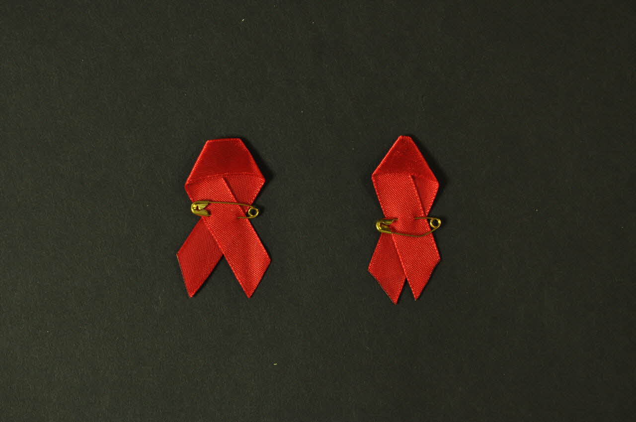 Les rubans rouges sont en tissu synthétiques. Le ruban est formé grâce à une épingle à nourrice en métal doré.Décor