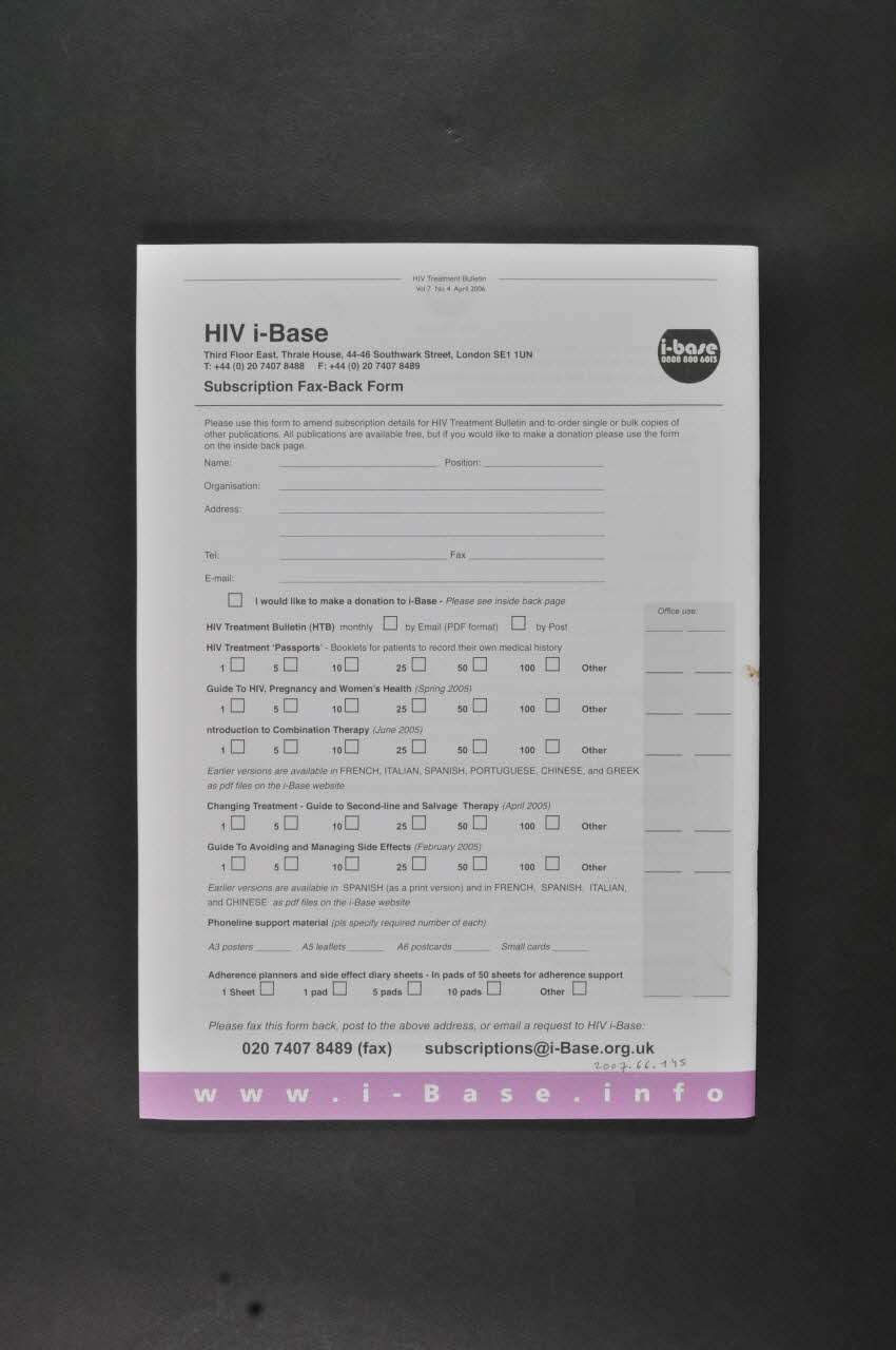 Published by HIV i-Base (En bas, sur le bandeau violet), sur la couvertureDécor