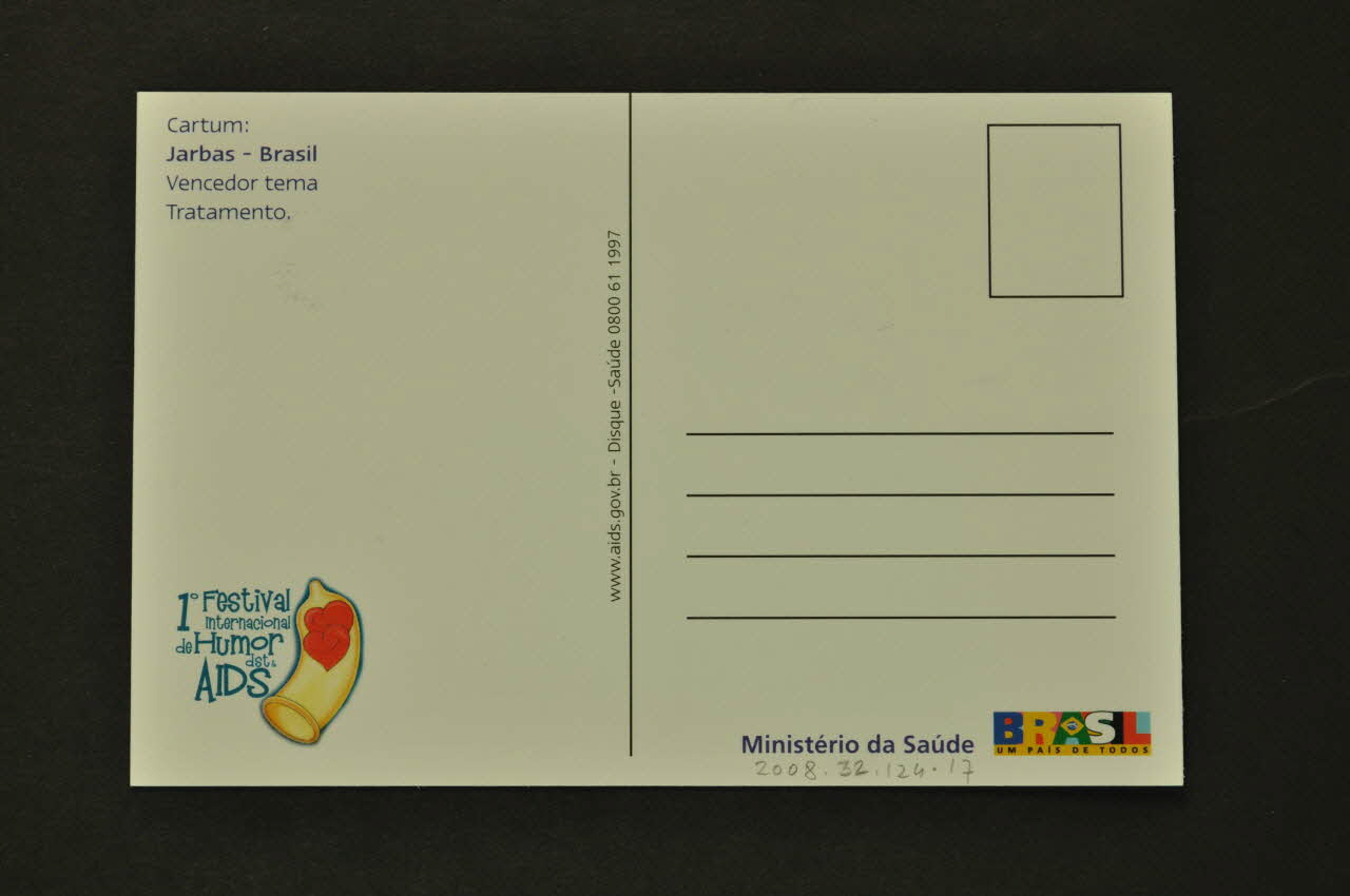 Ministério da Saúde BRASIL UM PAIS DE TODOS (en bas à droite), verso1° Festival // internacional // de Humor // dst & // AIDS (en bas à gauche, avec un dessin de deux coeurs dans un préservatif.), versoAdresse, date