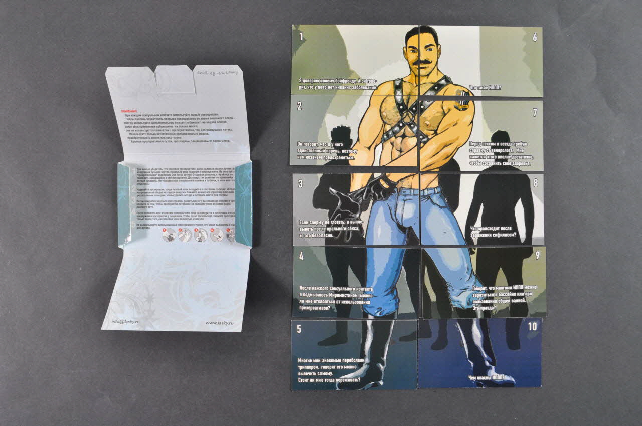 En haut, à gauche ou à droite, en blanc, se trouve un chiffre de 1 à 10 donnant l'ordre des morceaux. En bas, en petites capitales blanches, une question relative aux préservatifs. Au dos de chaque carte, sur un fond gris, on trouve en noir la réponse à la question du recto.