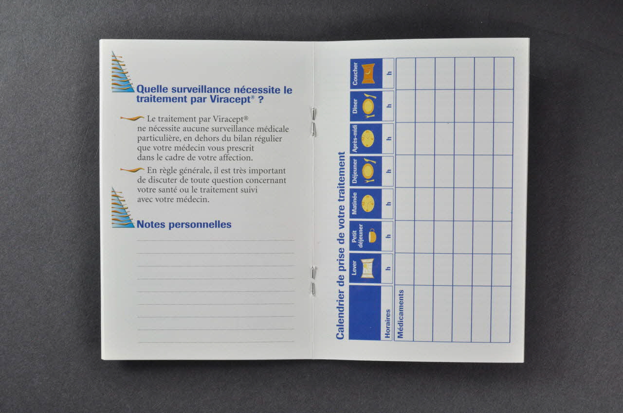 Pourquoi Viracept?"(...) "Le risque de transmission sexuelle ou sanguine existant toujours, vous devez continuer à prendre toutes les précautions pour éviter de contaminer une autre personne. » /«/ Où se procure-t-on Viracept?" (...) "vous pouvez vous procurer Viracept muni de votre ordonnance dans les pharmacies hospitalières ou dans les pharmacies de ville. » // « Comment se présente Viracept?" (...) "Conservation : à température ambiante (entre 15 à 30°) // Comment prendre Viracept"? (…) // Que faire en cas d'oubli?" (...) "Si vous avez besoin d'aide afin de mieux gérer les prises de Viracept, n'hésitez pas à vous adresser à votre médecin ou à votre pharmacien. »//« Peut-on prendre Viracept avec d'autres médicaments?" (...) "Signalez donc toujours à votre médecin les autres médicaments que vous êtes susceptibles de prendre. »//« Quels sont les effets secondaires possibles de Viracept?" (…)//« Quelle surveillance nécessite le traitement par Viracept? (...) "Notes personnelles" (à remplir)//« calendrier de prise de votre traitement » //les deux notices du médicament : poudre et comprimé (révision 12 mars 1999) (titres des paragraphes et indications en gras), rectoTexte