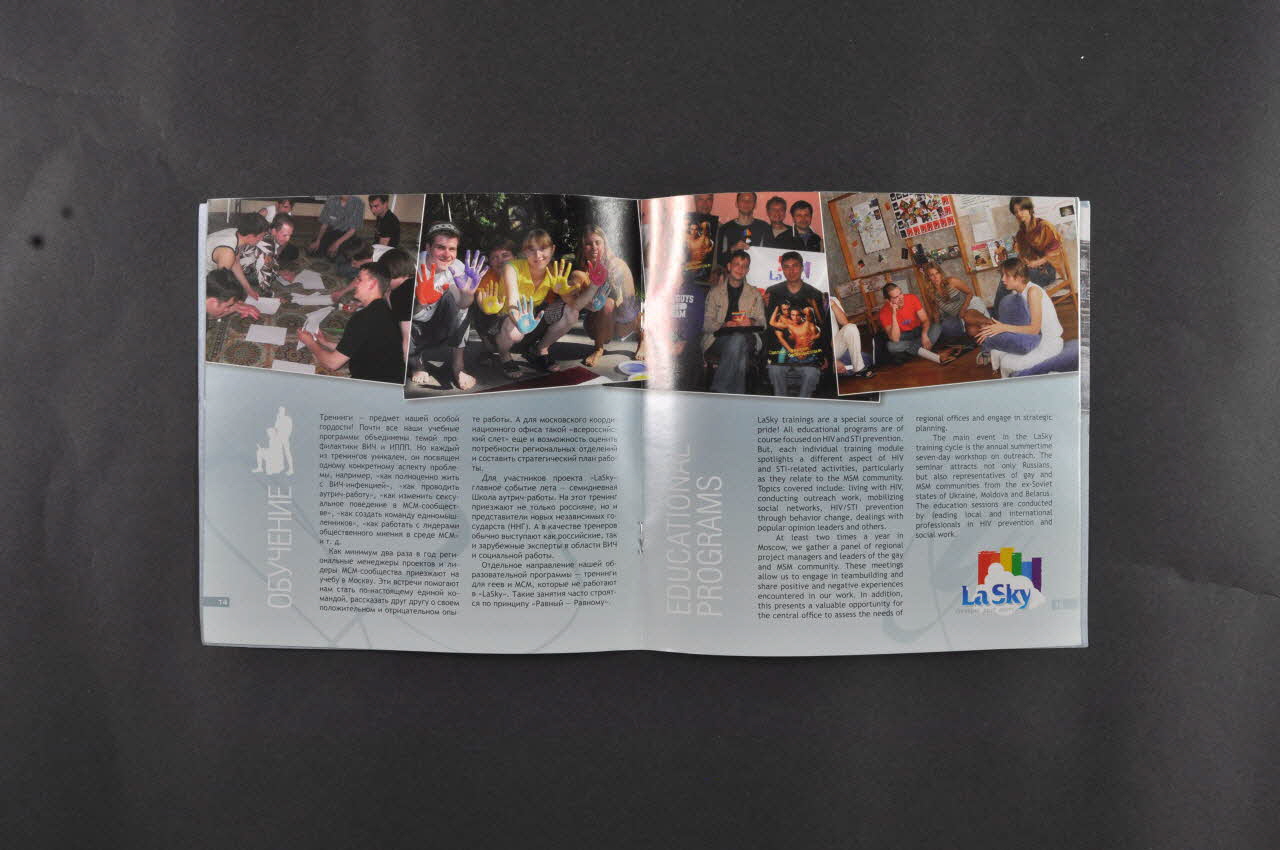 A l'intérieur, le texte est imprimé en noir sur deux colonnes. Les pages paires sont en russe ; les pages impaires en anglais. L'intitulé des parties est imprimé en blanc, verticalement sur le bord gauche des pages. De nombreuses photographies sont imprimées dans le haut des double pages. Le logo de l'association est imprimé au centre de la page 3 et est repris dans le bas des premières pages impaires. Celui-ci représente un nuage placé devant des rectangles colorés aux couleurs de l'arc-en-ciel. Du texte est imprimé en bleu sur le nuage blanc.