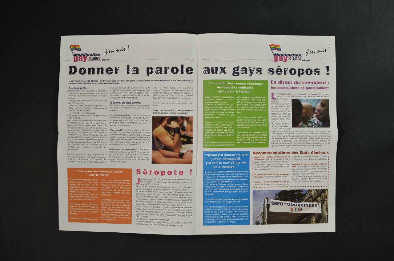 La couverture comporte le titre dans le coin supérieur gauche avec un drapeau multicolore et un ruban rouge au centre de celui-ci. Un logo d'association figure dans le coin supérieur droit. Le reste de la page est occupé par un texte en noir sur fond blanc à gauche et en blanc dans un encadré bleu à droite. Une photographie couleur représentant deux hommes vus de dos se tenant par l'épaule figure en haut de l'encadré bleu. Dans le coin inférieur gauche, se trouve un dessin représentant deux homme vus de profil et prêts à s'embrasser.