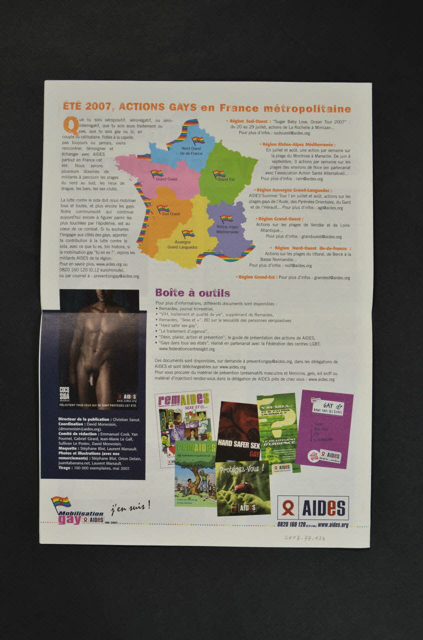 Le dos du journal comporte du texte, une carte de France, une photographie d'un homme nu et la reproduction de divers dépliants en couleur.