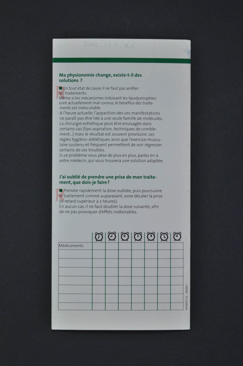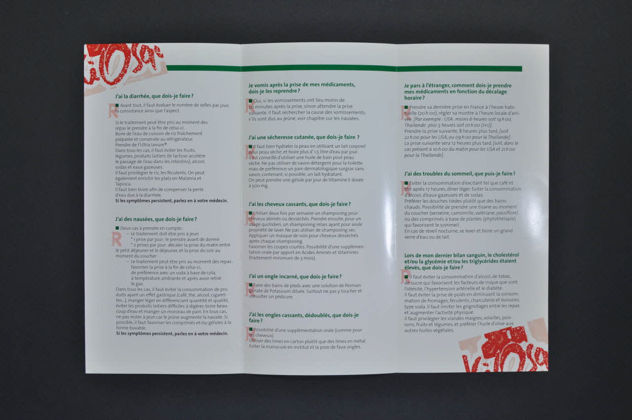 "Les effets indésirables dus aux traitements antirétroviraux existent." "Des solutions simples peuvent être appliquées." "Avant toute chose il faut en parler à votre médecin ou à votre pharmacien.", sur la couvertureJ'ai la diarrhée, que dois-je faire ? // J'ai des nausées, que dois-je faire ?" // Je vomis après la prise de mes médicaments, dois-je les reprendre? // J'ai une sécheressse cutanée, que dois-je faire? // J'ai les cheveux cassants, que dois-je faire? // J'ai un ongle incarné, que dois-je faire // J'ai les ongles cassants, dédoublés, que dois-je faire ? // Je pars à l'étranger, comment dois-je prendre mes médicaments en fonction du décalage horaire? // J'ai des troubles du sommeil, que puis-je faire? // Lors de mon dernier bilan sanguin, le choléstérol et/ou la glycémie et/ou les triglycérides étaient élevés, que dois-je faire? // Comment puis-je corriger mon alimentation? // Et le sport dans tout ça? // Ma physionomie change, existe-t-il des solutions? // J'ai oublié de prendre une prise de mon traitement, que dois-je faire? (seules les questions en vert sont transcrites), à l'intérieurNom d'association