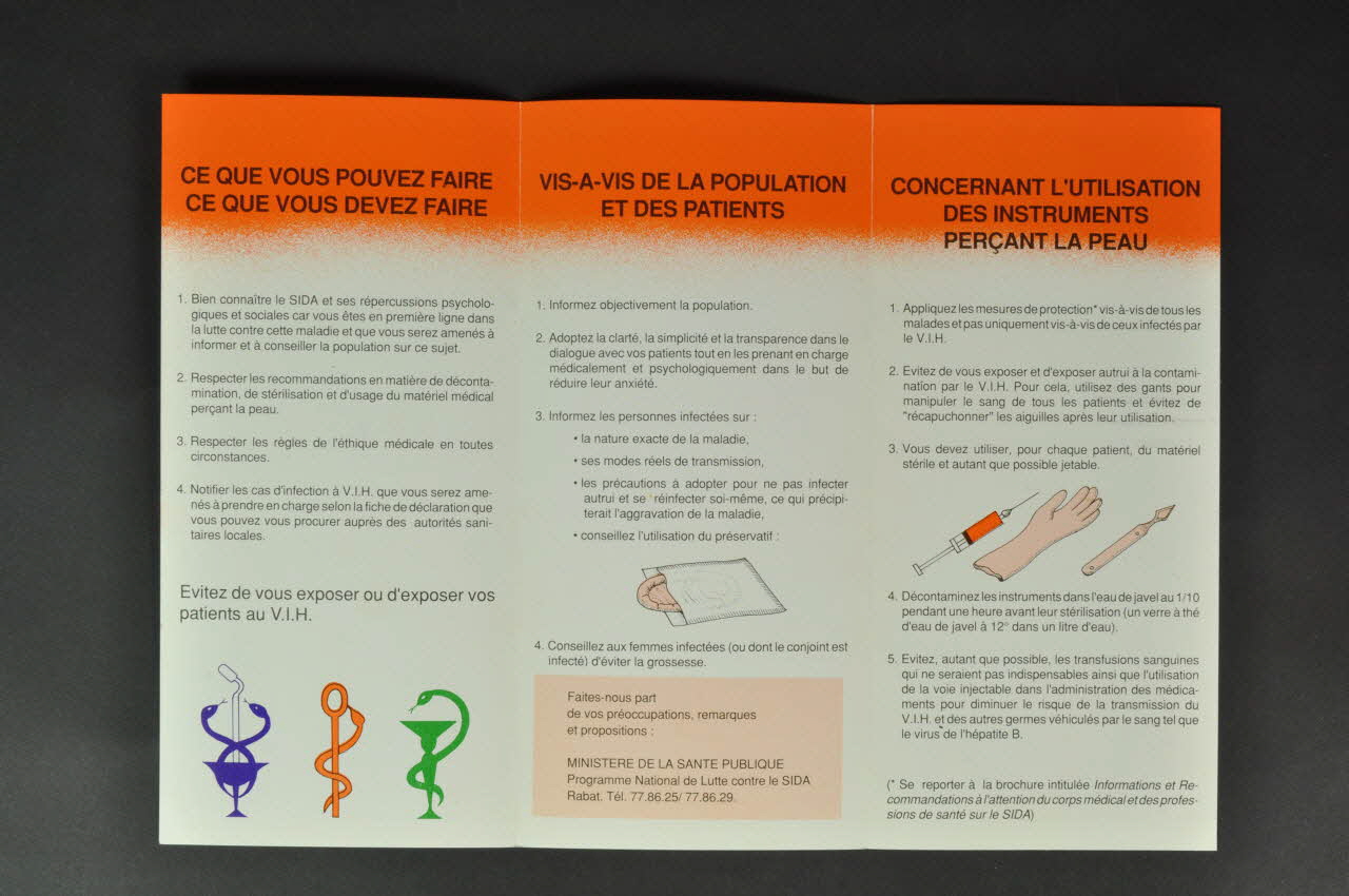 CE QUE VOUS POUVEZ FAIRE // CE QUE VOUS DEVEZ FAIRE // // VIS-A-VIS DE LA POPULATION // ET DES PATIENTS // // CONCERNANT L'UTILISATION // DES INSTRUMENTS // PERCANT LA PEAU // // EN MATIERE D'ETHIQUE // // QU'EST CE QUE LE SIDA (Titres placés dans la partie supérieure de chaque feuillet.), à l'intérieurLogo