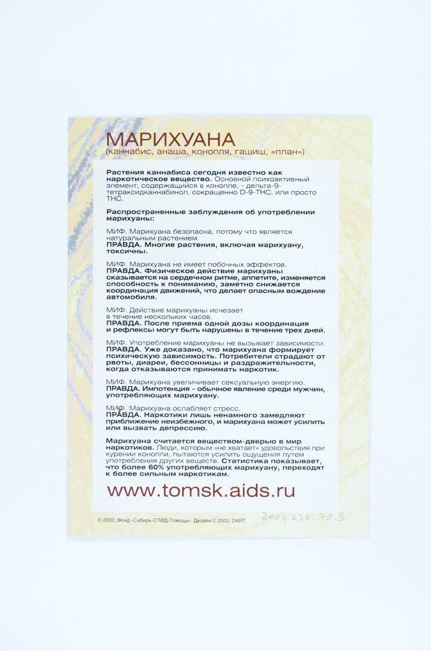 2004.236.70 1 à 3 : Cartes présentées comme un ensemble pour l'association. Verso, sens vertical. Encadrement jaune. Sur l'encadrement, en caractères cyrilliques bruns : Marijuana et en dessous, 5 mots différents dont cannabis. Au centre, sur fond blanc, texte sur les risques du cannabis en petits caractères cyrilliques noirs.