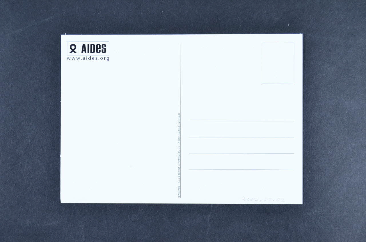 Le recto présente la photographie sur un fond blanc d'un dé blanc avec de inscriptions noires. Dans l'angle inférieure droit, il y a le logo de AIDES avec un ruban rouge. Les auteurs de la photographie sont mentionnés dans l'angle supérieur gauche. Le verso est blanc avec l'espace pour la correspondance. Dans l'angle supérieur gauche, il y a le logo de AIDES.Inscriptions