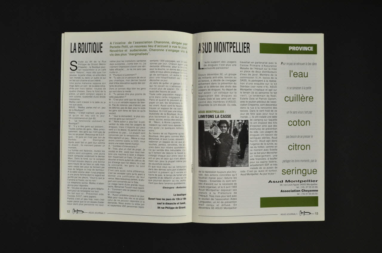 - désinfection des seringues, préservatif à 1 franc, réduction des risques, dealers, Allocation Adulte Handicapé, parole de l'usager, association, usage de drogue, BD, préservatif, humour