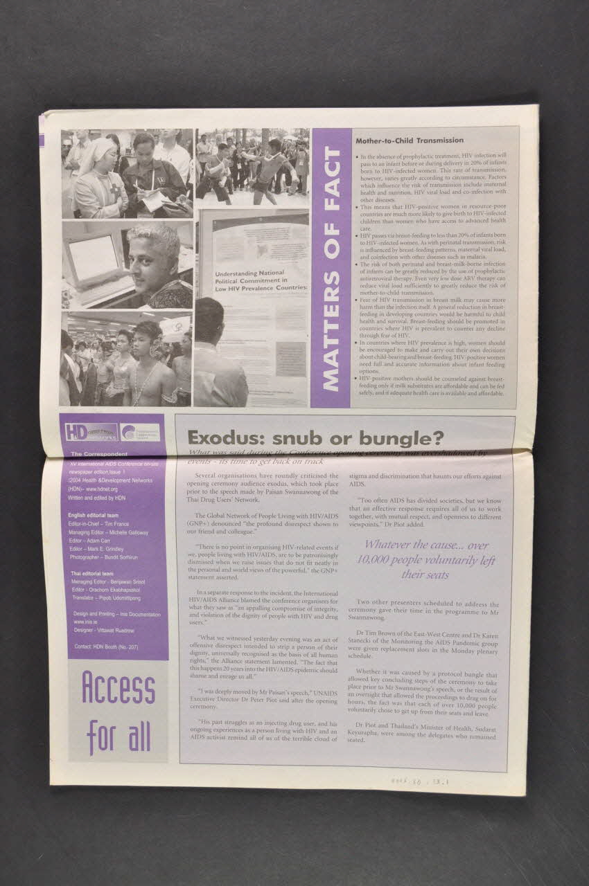 Revue distribuée tous les jours à la conférence. Résumé: Page 1. Le podium pléniaire. Le président de l'Ouganda et la Princesse Mabel d'Orange-Nassau Page 2. Le retard des Etats donateurs du G7 Page 3. Le dépistage du VIH dans les pays pauvres Page 3. Mise en question de l'efficacité du fonds mondial Page 3. Les soins aux orphelins et aux enfants vulnérables Page 4-5 Articles en thai Page 6 Les migrants pour des raisons médicales Page 7 Prévention de la tuberculose Page 8 Les relations entre le nord et le sud Page 8 Stigmatisation : la même vieille histoire Page 9 Microbicides ou préservatif féminin Page 10 La prévention est-elle aussi simple qu'ABC ? Page 12 Données sur la transmission mère enfant Page 13 La cérémonie d'ouverture : pourquoi de nombreux délégués sont ils partis avant la fin?