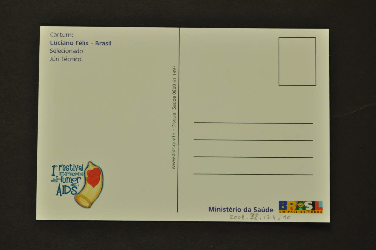 Ministério da Saúde BRASIL UM PAIS DE TODOS (en bas à droite), verso1° Festival // internacional // de Humor // dst & // AIDS (en bas à gauche, avec un dessin de deux coeurs dans un préservatif.), versoAdresse, date