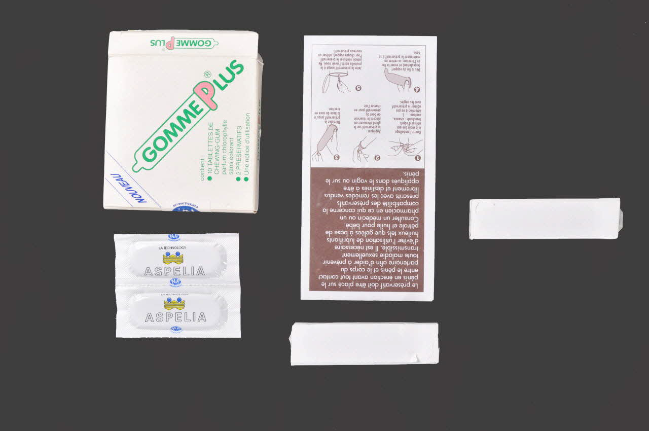 gomme, Emballage de 2 préservatifs et 10 tablettes de Chewing-gum "Gomme Plus "