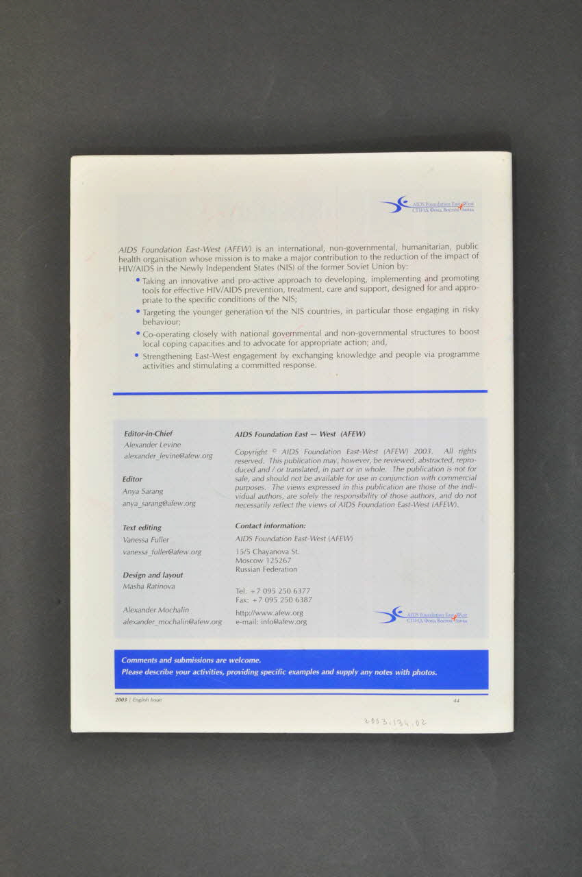 Published by AIDS Foundation East-West (AFEW) (L'inscription figure dans la partie supérieure de la première de couverture.), sur la couvertureSous-titre