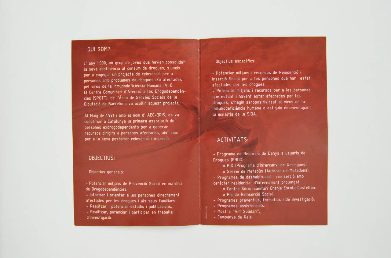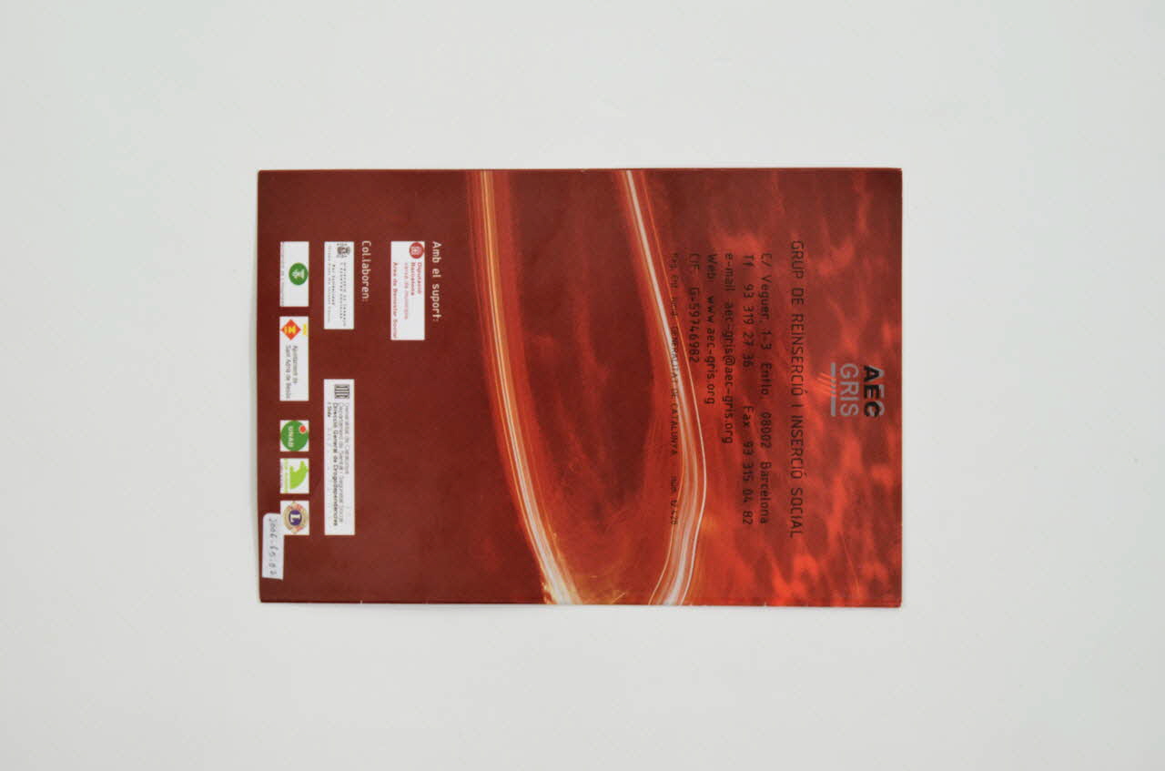 AEC // GRIS (en haut), versoAmb el supoert // // Ditputacio // Barcelona // xarxa de municipis // Area de Bestar Social // // Col.laboren: // Ministerio de trabajo // y asuntos sociales // por solidaridad // OTROS FINES DE INTERES SOCIAL // // Generalitat de Catalunya // Departament de Sanitat i Seguretat Social // Direccio General de Drogodependencies i Sida // // Ajuntament de l'Hospitalet // // Ajuntament de Sant Adria de Besos // // UNAD // // CAJA MADRID // OBRA SOCIAL // // LIONS // L (en bas), versoSous-titre