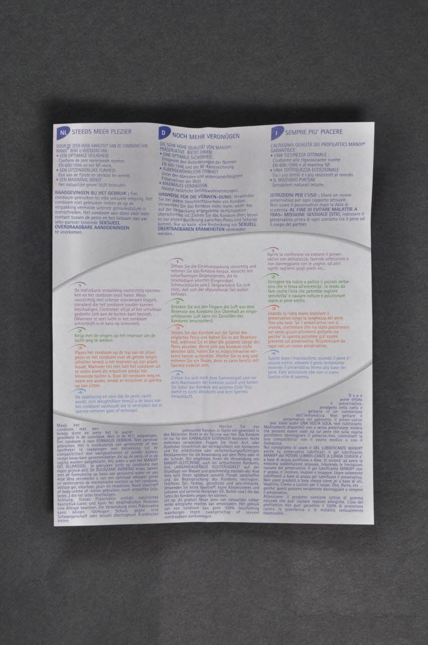 Le texte, traduit en néerlandais, en allemand et en italien au verso, est illustré de quatre petits schémas, prenant place dans des disques colorés.Décor