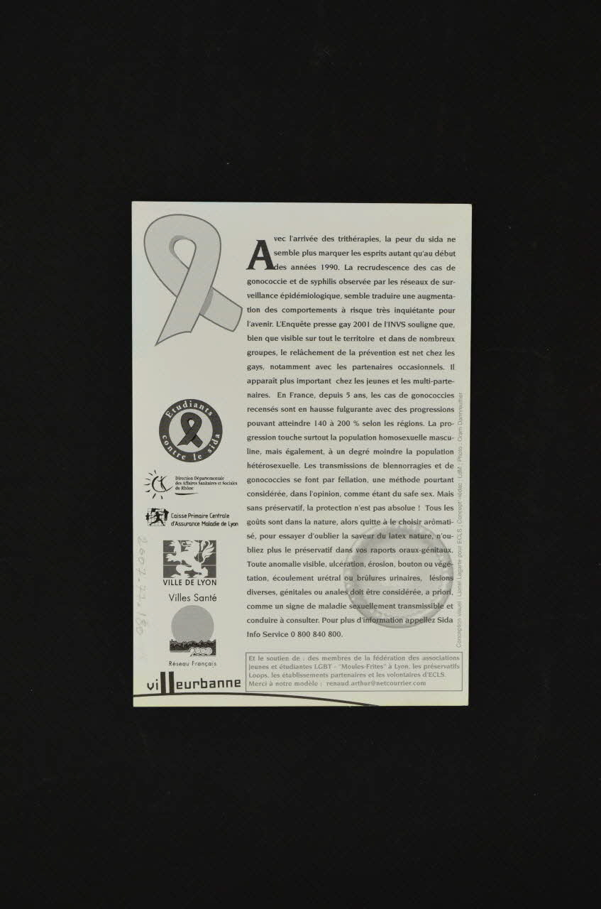 Au recto, figure une photographie pleine page d'un jeune homme torse nu portant un piercing à l'arcade sourcillière droite et tenant une sucette-préservatif, sur un fond de ciel. Un titre est en haut à gauche en rouge, tandis qu'apparaît une adresse de site internet de la même couleur en bas à droite. Le verso, imprimé en noir sur fond blanc, comporte sur la gauche plusieurs logos ((Etudiants contre le sida, DDASS du Rhône, Caisse Primaire Centrale d'Assurance Maladie de Lyon, Ville de Lyon, Réseau Français Villes Santé, Villeurbanne), et sur la droite un texte. En bas du texte se trouve un encadré contenant les remerciements aux soutiens.Inscriptions