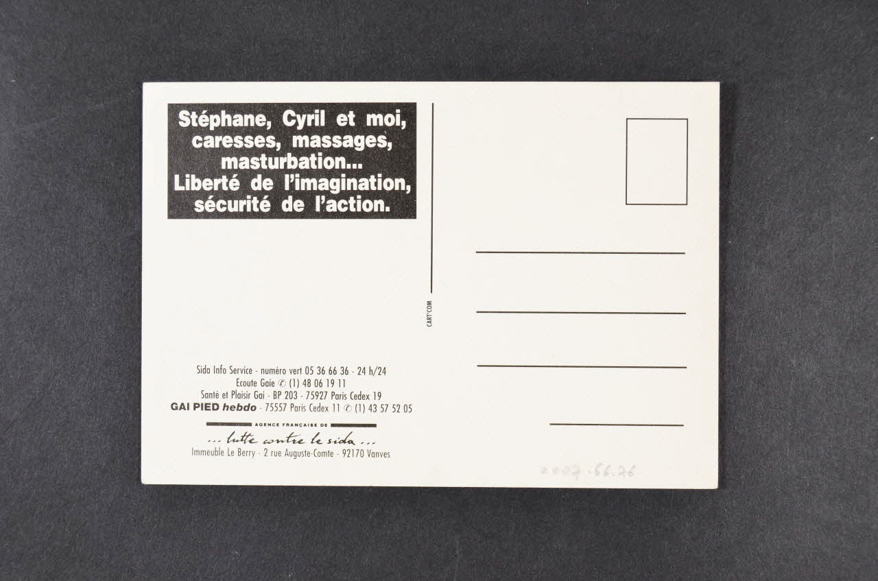 Le recto se compose à gauche d'une photographie de trois hommes ayant des relations sexuelles sur laquelle est inscrite en haut une inscription blanche, et à droite, un bandeau blanc portant des inscriptions grises et noires ainsi que trois logos. Le verso comporte sur la gauche un encart noir portant un texte blanc en haut suivi d'un texte en bas, et à droite, un emplacement prévu pour remplir des coordonnées.Inscriptions
