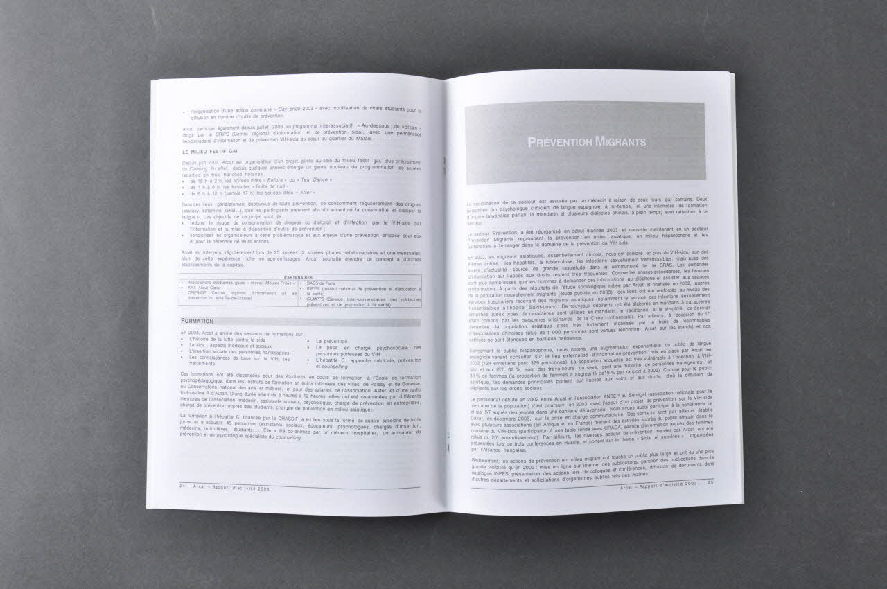La couverture présente, en haut, le logo d'ARCAT et du Groupe SOS. En bas, les coordonnées. En haut, sous les logos, le titre surmonte un montage de seize vignettes couleurs représentant les publications de l"association. Le rapport est imprimé en noir. Il présente les thèmes suivants : SOCIAL ET PREVENTION (description de l'activité et exemples de situation) Accueil du public Profil des personnes accueillies L'accompagnement social : l'hébergement et le logement / l'accès aux soins / l'accès aux droits sociaux / les aides financières Insertion professionnelle Le conseil médical Le soutien psychologique Conseil juridique / Collectifs interassociatifs (observatoire du droit à la santé des étrangers / Collectif droit et prostitution Prévention en milieu étudiant et en milieu festif gai : Etablissements d'enseignement supérieur / Restaurants universitaires / Associations étudiantes gaies Formation PREVENTION MIGRANTS Migrants asiatiques Migrants hispanophones SECTEUR MEDICAL ET THERAPEUTIQUE Actions VIH : Le répertoire de la recherche clinique / Le lobbying et la participation au TRT5 / Le soutien aux patients Action VHC PREVENTION EN ENTREPRISES : Accompagner les professionnels sanitaires et sociaux / Sensibiliser les salariés / Peser sur des enjeux politiques INFORMATION - EVENEMENTIEL Les éditions (liste et description des publications) Le journal de la Démocratie sanitaire Le site internet Evénementiel : Braderies / Portes ouvertes / Gay Pride / Solidays / Course Paris-Versailles Arcat dans les médiasInscriptions
