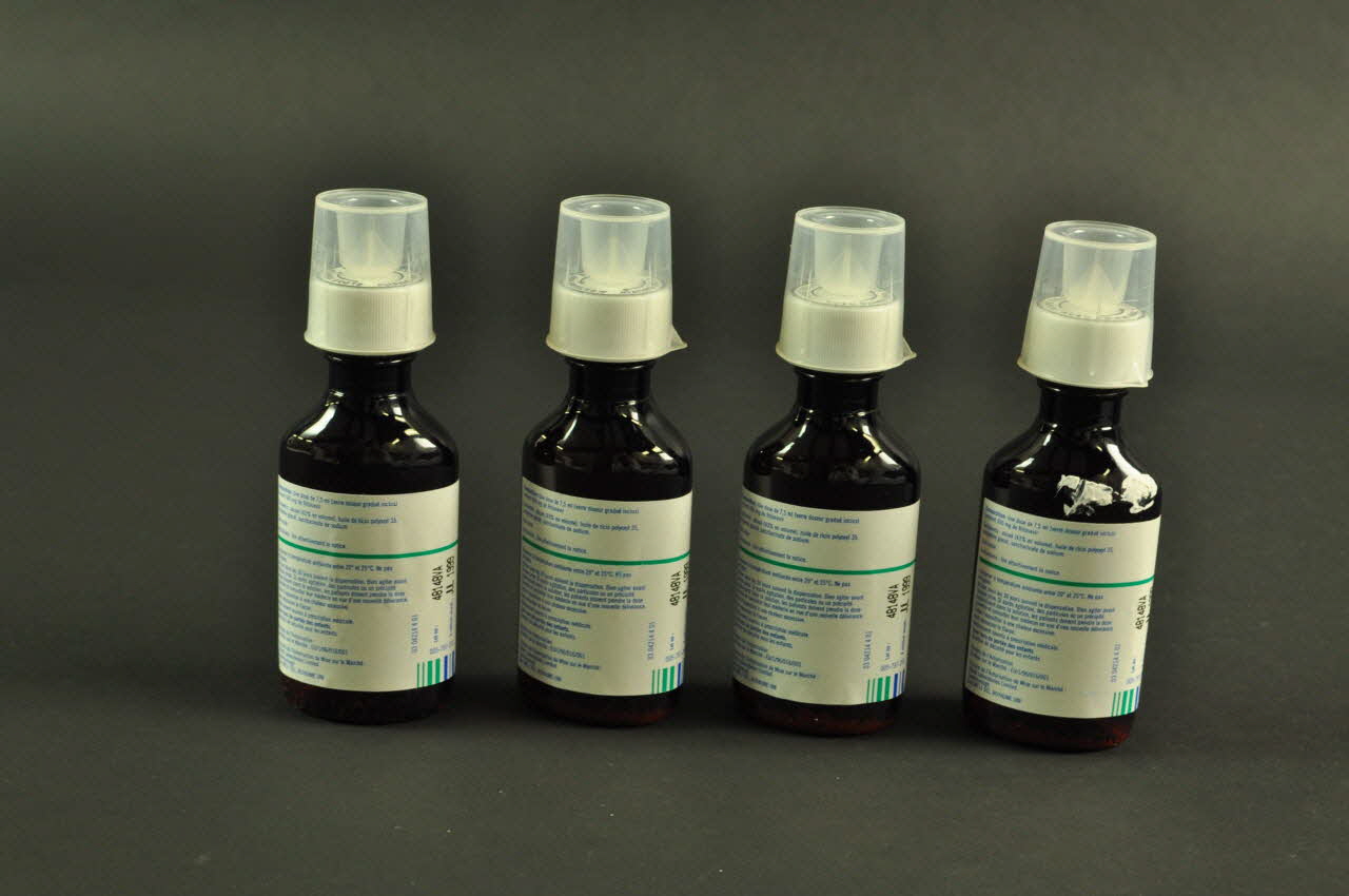 Il s'agit de flacons ovales, en verre teinté, de couleur marron, fermés par un couvercle en plastique moulé blanc qui comporte des inscriptions. Un petit verre doseur en plastique transparent est posé sur le dessus du couvercle. Une étiquette autocollante et imprimée se situe sur les paroies des flacons.Inscriptions
