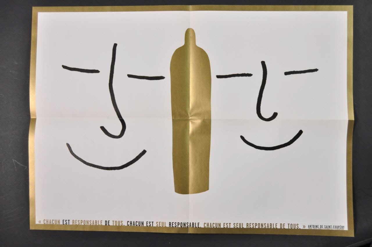 Sur l'avant, on trouve une inscription de couleur or et noire accompagnée d'une citation en petits caractères sur la droite. A l'intérieur, les bordures sont dorées et au centre est illustré un préservatif doré au milieu de deux figures constituées de traits formant des visages. Une inscription est inscrite dans le bas. A l'arrière de l'affiche, un long texte de lettres dorées et noires est organisé en trois colonnes. Un titre en plus grands caractères se trouve dans le haut.Inscriptions