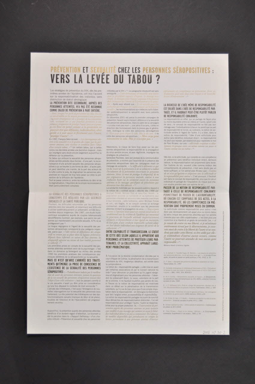 MERCI // A CEUX // QUI // LUTTENT (Titre de l'affiche inscrit sur l'avant de l'affiche en lettres dorées et noires), au centrePRÉVENTION ET SEXUALITÉ CHEZ LES PERSONNES SÉROPOSITIVES: // VERS LA LEVÉE DU TABOU ? (Titre du texte au dos de l'affiche), en hautTexte