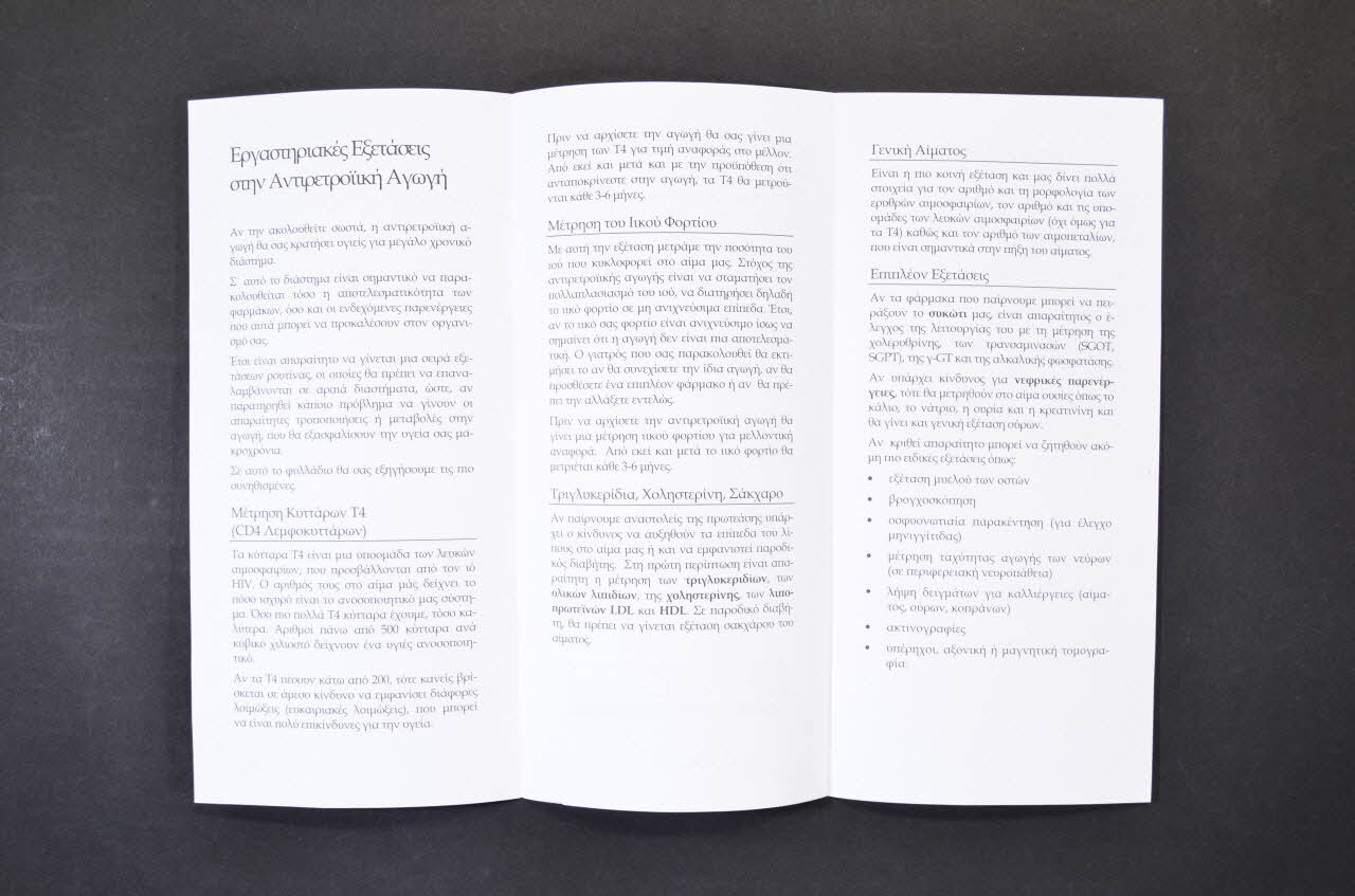 Dépliant, "Ergastèriakes ezetaseis stèn Antiretroikè agogè" (Sur les tests de charge viirale)