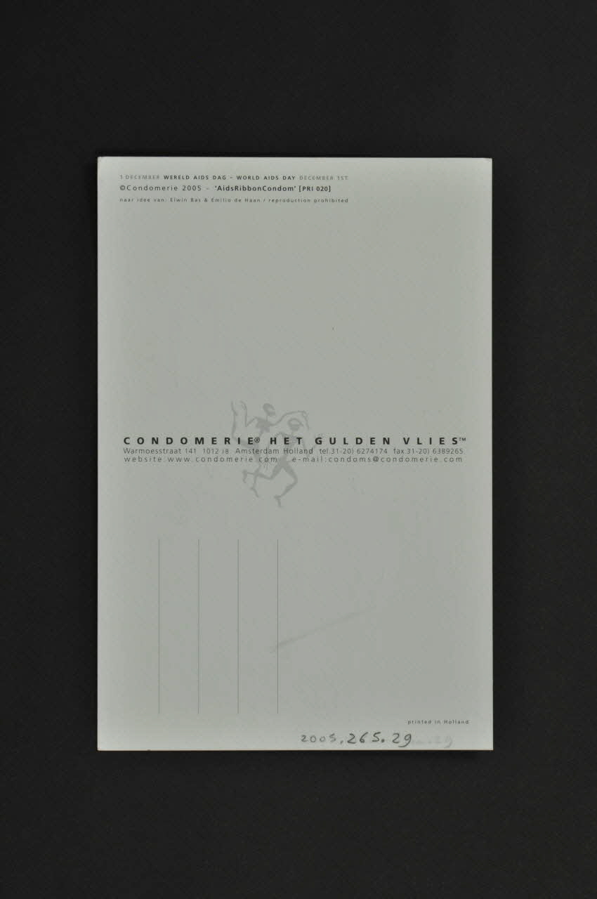Sur le recto à fond noir, on peut voir, au centre un préservatif rouge plié en forme de ruban rouge avec en dessous, en petites capitales blanches et rouges, en néerlandais et en anglais une date anniversaire. Tout en bas, il y a le logo et l'adresse internet de la Condomerie. Au verso, sur un fond blanc, on trouve des emplacements pour écrire la carte postale et à gauche, verticalement, en petits caractères noirs la reprise de la date anniversaire et au centre de la carte, en séparation, il y a le logo et les coordonnées internet de La Condomerie. Cf affiche 2005.265.32Inscriptions