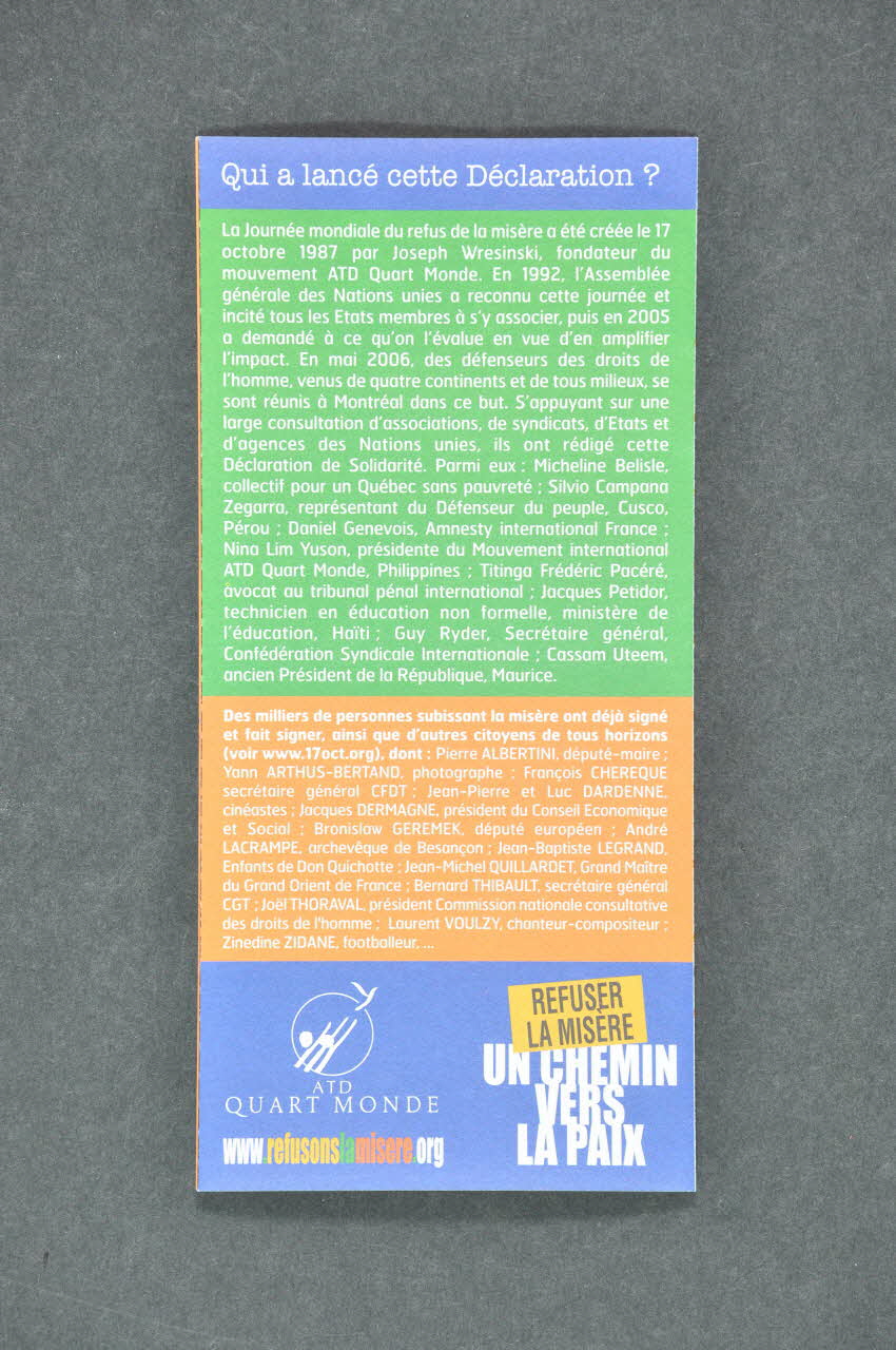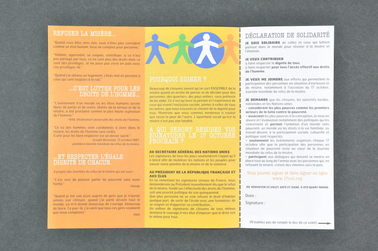 Qui a lancé cette Déclaration ? (en blanc, en haut d el'arrière du dépliant), en hautREFUSER LA MISERE ... // // ... C'EST LUTTER POUR LES // DROITS DE L'HOMME ... // // ... ET RESPECTER L'EGALE // DIGNITE DE CHACUN. (titres en blancs dans les textes intérieurs de la page de gauche), à l'intérieurPOURQUOI SIGNER ? // // A QUI SERONT REMISES VOS // SIGNATURES LE 17 OCTOBRE // PROCHAIN ? (titres en blancs dans les textes intérieurs de la page du centre), à l'intérieurDECLARATION // DE SOLIDARITE. (de la couverture, en noir sous le slogan), en hautLogo, nom