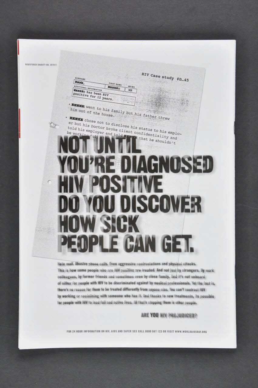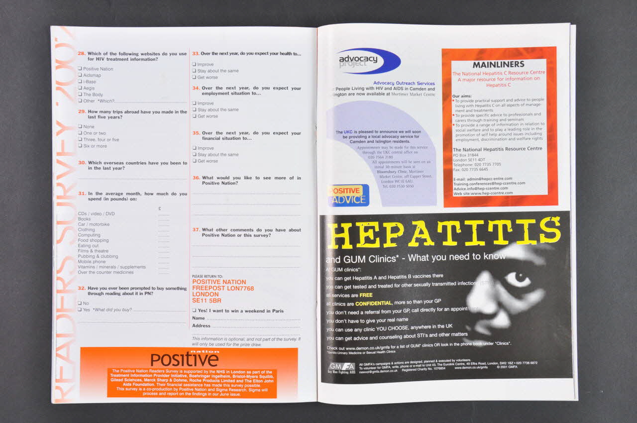 nation // positive (En partie supérieure, en caractères oranges et violets), sur la couvertureHeroes // Elton & Andy // celebrate the first HIV patient group award (En caractères rouge, blanc, gris, au centre.), sur la couvertureHIV is my health...isn't it? (Sur le recto de la carte postale, en caractères blancs sur fond bleu clair, au dessus du dessin.)Sommaire
