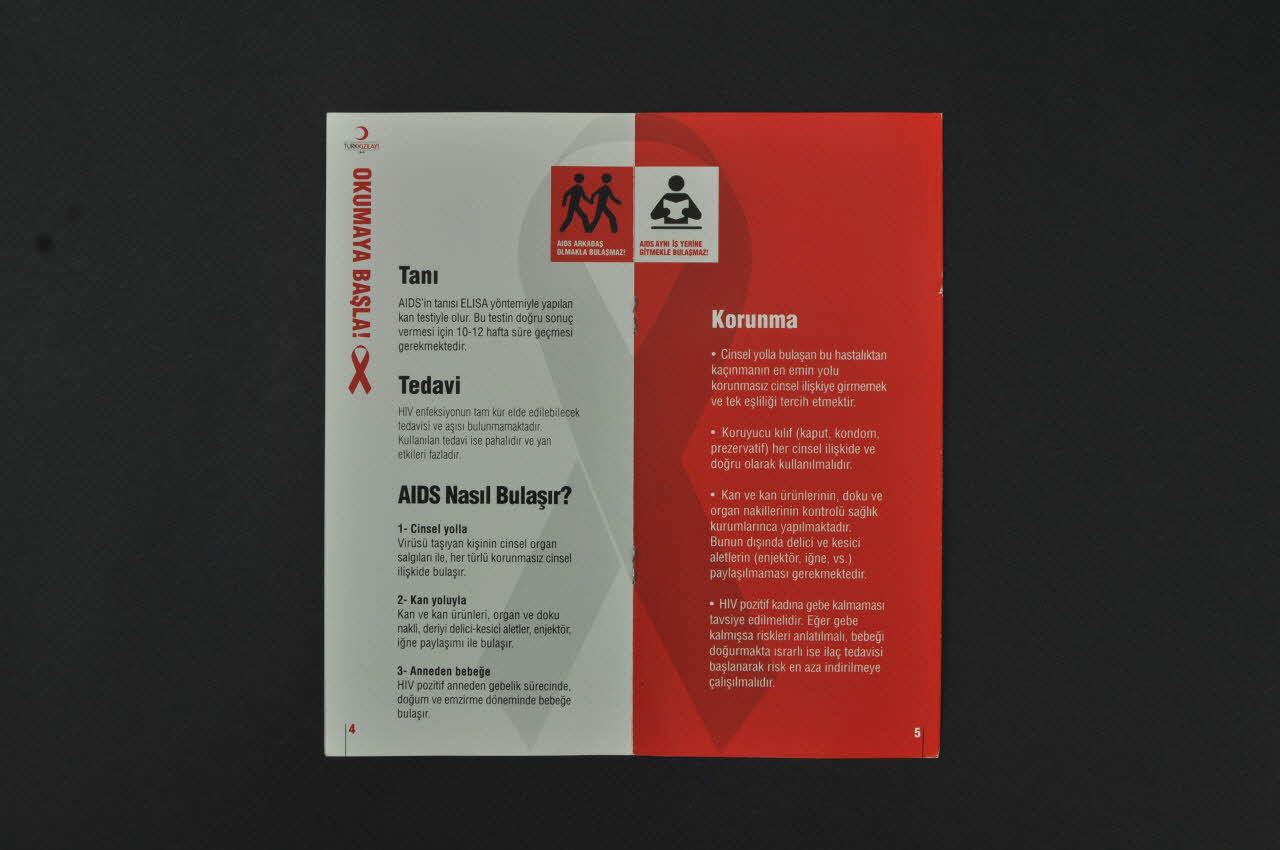 Résumé: - p.2 Logo du Croissant rouge avec en dessous, en noir, numéros de téléphone utiles. - p.3 AIDS Nedir? (en noir) / En dessous, texte en blanc - p.4 Verticalement à gauche, en rouge, logo du Croissant rouge, puis, en petites capitales rouges : "Okumaya Basla !" (traduire), puis petit ruban rouge. En haut, à droite, petiit carré rouge avec deux silhouettes masculines se tenant par la main et en dessous, en blanc : "AIDS Arkadas Olmakla bulasmaz !". En dessous, texte avec trois sous titres : Tani / Tedavi / AIDS Nasil Bulasir ? - p.5 En haut, à gauche, petiit carré blanc avec une silhouette tenant un livre et en dessous, en rouge : "AIDS Ayni is yerine gitmekle bulasmaz !" En dessous, texte avec comme sous titre : Korunma. - p.6 Verticalement à gauche, en rouge, logo du Croissant rouge, puis, en petites capitales rouges : "Okumaya Basla !" (traduire), puis petit ruban rouge. En haut, à droite, petiit carré rouge avec deux silhouettes et en dessous, en blanc : "AIDS okula gitmekle bulasmaz !". En dessous, texte avec comme sous titre : AIDS' in Bulasmadigi Durumlar. - p.7 En haut, à gauche, petiit carré blanc avec un moustique et en dessous, en rouge : "AIDS sivrisinek isirmasiyla bulasmaz !" En dessous, texte avec comme sous titre : Dünyada ve Türkiye' de AIDS" Et, en bas, en grandes italiques blanches : "Unutmayin, tedbirler alarak ve riskleri azaltarak hem kendinizi hem de baskalarini korumak hepimizin görevi !"