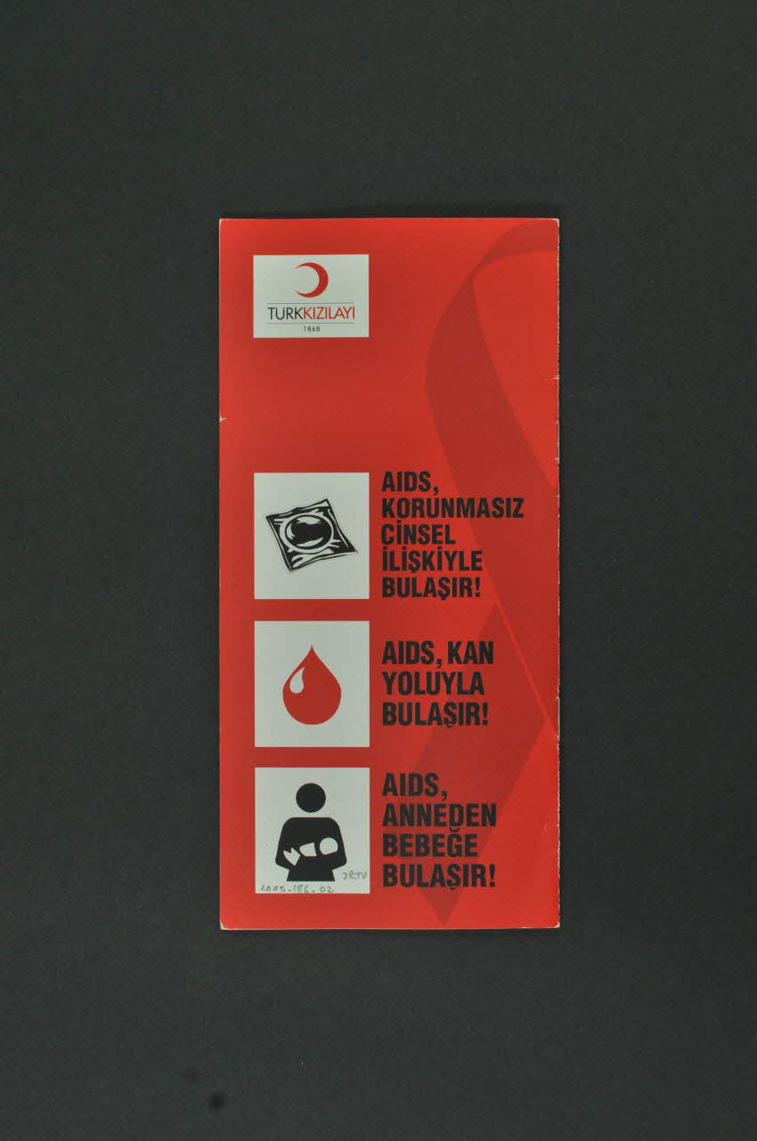 AIDS, // Korunmasiz // cinsel // iliskiyle // bulasir! // // AIDS, Kan // yoluyla // bulasir! // // AIDS, // Anneden // bebege // bulasir! (Verticalement, se trouvent trois carrés blancs contenant respectivement un préservatif, une goutte de sang rouge et une silhouette de mère tenant bébé. A droite de chacun, se trouve une inscription en petites capitales noires), versoTitre