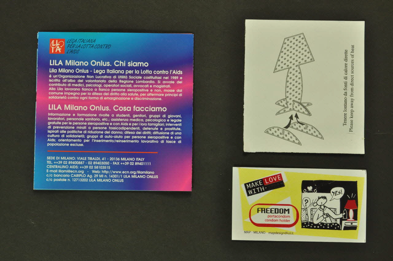 Il s'agit de trois éléments : un schéma de montage (.2) de la lampe, un petit flyer (.3) et un dépliant(.4). La notice de montage est imprimée en noir sur une petite feuille blanche rectangulaire. Elle présente un schéma et au dessous une instruction bilingue italien et anglais. Le flyer se compose d'un dessin et d'instructions imprimés en noir, rouge et jaune sur une petite feuille de papier rectangulaire. L'image représente un homme en pyjama assis dans un lit, sortant un préservatif de la lampe. Sa tête est tournée tandis qu'il s'adresse à une personne à sa droite. Le dépliant est constitué d'une feuille de papier glacé imprimée et pliée en trois volets. Des textes en italien sont inscrits en noir sur des fonds abstraits bleu, rose, vert, violet. De petits panneaux routiers avec des flèches allant dans différents sens sont présents en bas des trois textes intérieurs.Inscriptions