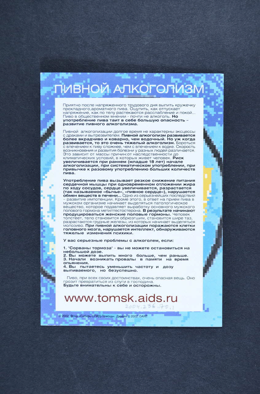 2004.236.70 1 à 3 : Cartes présentées comme un ensemble pour l'association. Les inscriptions blanches en haut du recto et du verso sont relatives à l'alcoolisme. Au verso, au centre, sur fond blanc, texte de prévention de l'alcoolisme en petits caractères cyrilliques noirs.