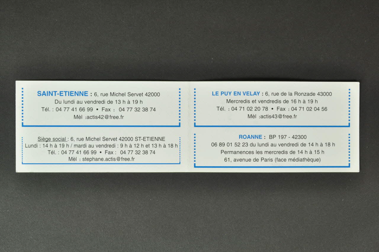 Le petit dépliant de carton et avec deux volets est de forme rectangulaire. C'est une carte de visite de l'association imprimée en noir et bleu sur fond blanc. La couverture a une grande inscription en bleue, et en bas des inscriptions en noir et bleu. Le dos et l'intérieur présentent des inscriptions en noir et bleu.Décor